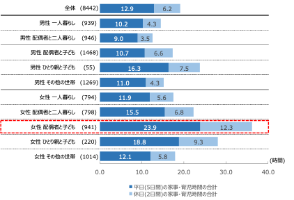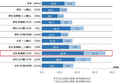- 働く人の1週間の総家事時間は19.1時間。最も長いのは配偶者+子ども世帯の女性で36.2時間【図3】