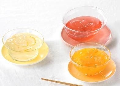 お箸でくずせば、ぶるぶるのジュレに早変わり。爽やかな葛きり入りゼリーです。この季節ならではの柚子、温州みかん、赤しその3種入り。