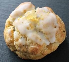 全粒粉入りの生地にレモンピールと刻んだピスタチオを練り込んで焼き上げ、レモンのグレーズで仕上げました。
