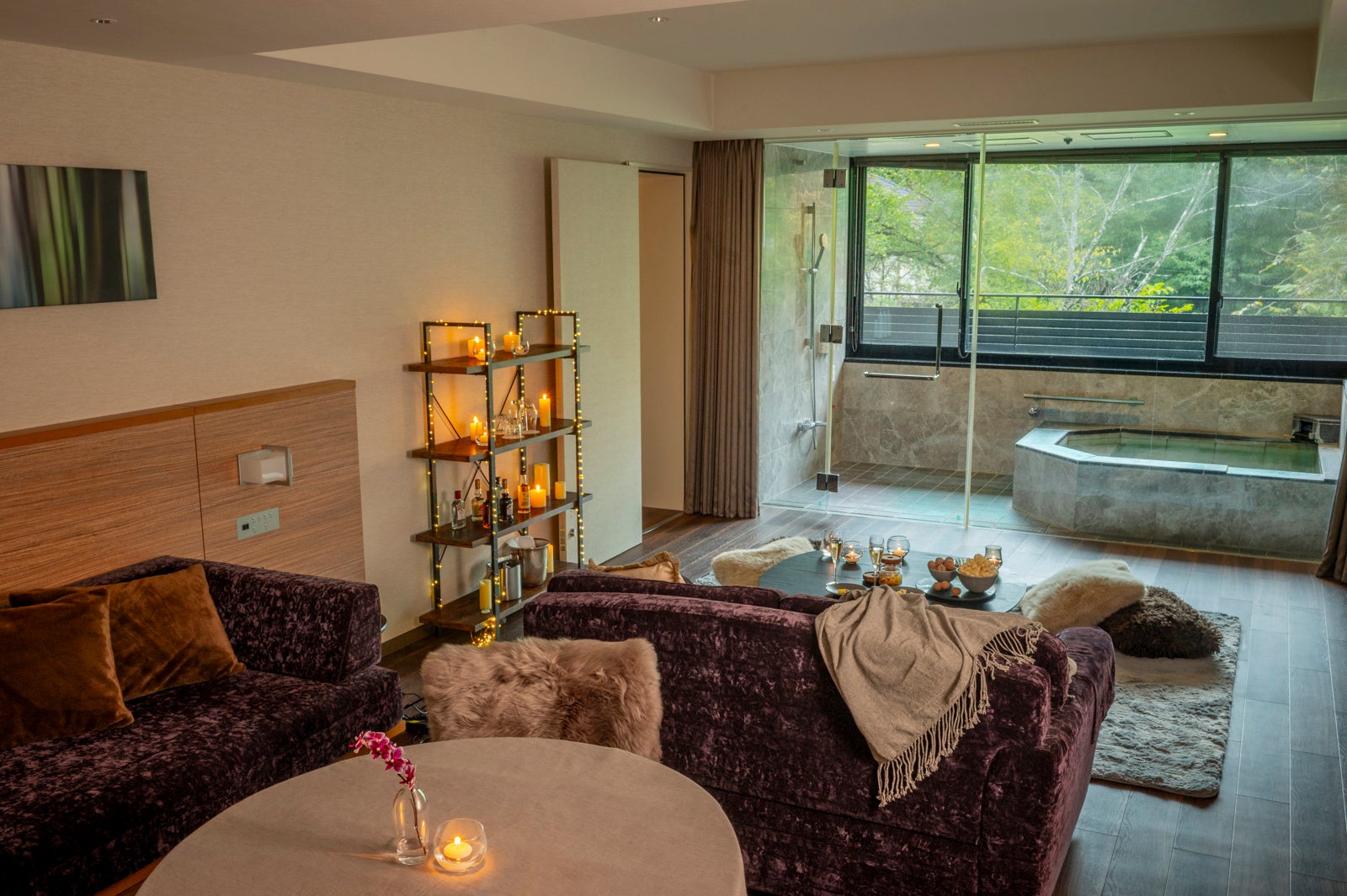 室内のリビングスペースでは、大型スクリーンで映画を観たり、オーディオブックに耳を傾けながら、ゆったりとお寛ぎいただけます。また、ウイスキーやリキュールのミニボトル、限定スナック3種(塩トリュフポップコーン、東御産信濃くるみ、信州産ドライフルーツ)もご用意。湯上りには、軽井沢の人気店Gelateria(ジェラテリア) Gina(ジーナ)のジェラートもお楽しみいただけ、客室で贅沢な時間をお過ごしいただけます。