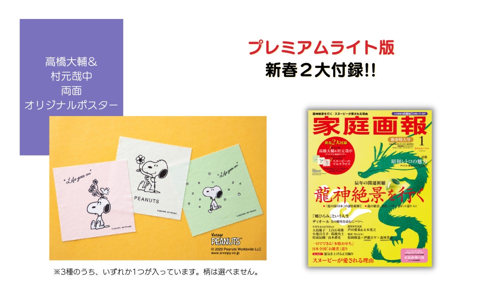※『家庭画報 2024年1月号』通常版、プレミアムライト版では特別付録として、さまざまな場面で活躍する「スヌーピーマルチクロス」を付けて販売します。通常版、プレミアムライト版で、サイズを変えてそれぞれ3種類のデザインをご用意。いずれか1枚がついています。