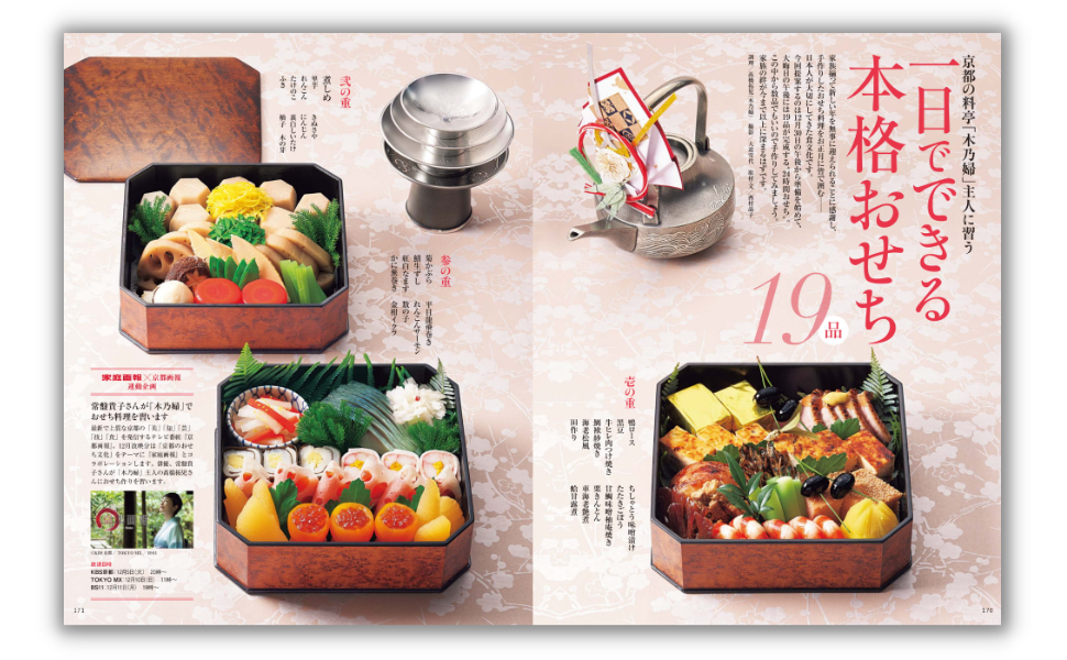 家族揃って新しい年を無事に迎えられることに感謝し、手作りしたおせち料理をお正月に皆で囲む。日本人が大切にしてきた食文化です。今回、京都「木乃婦」主人・髙橋拓児さんと提案するのは、12月30日の午後から準備を始めて、大晦日の午後には19品が完成する“24時間おせち”。この中から数品でもいいので手作りしてみましょう。家族の絆が今まで以上に深まるはずです。