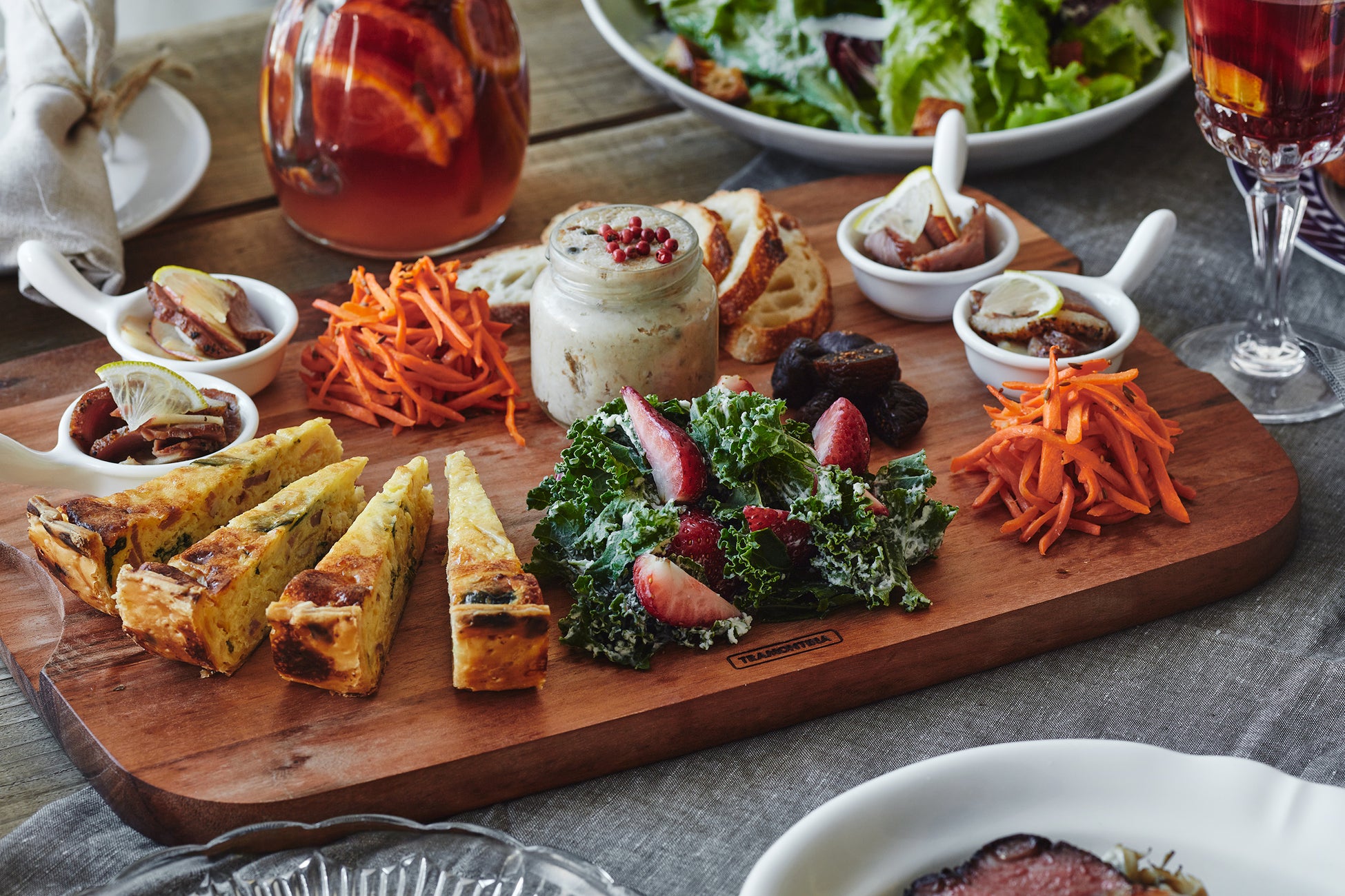 色とりどりの前菜に、手作りのシーザードレッシングで合わせた新鮮野菜のサラダや、ブーランジェリーカフェならではの焼き立てパンで作るガーリックトーストをご用意しました。