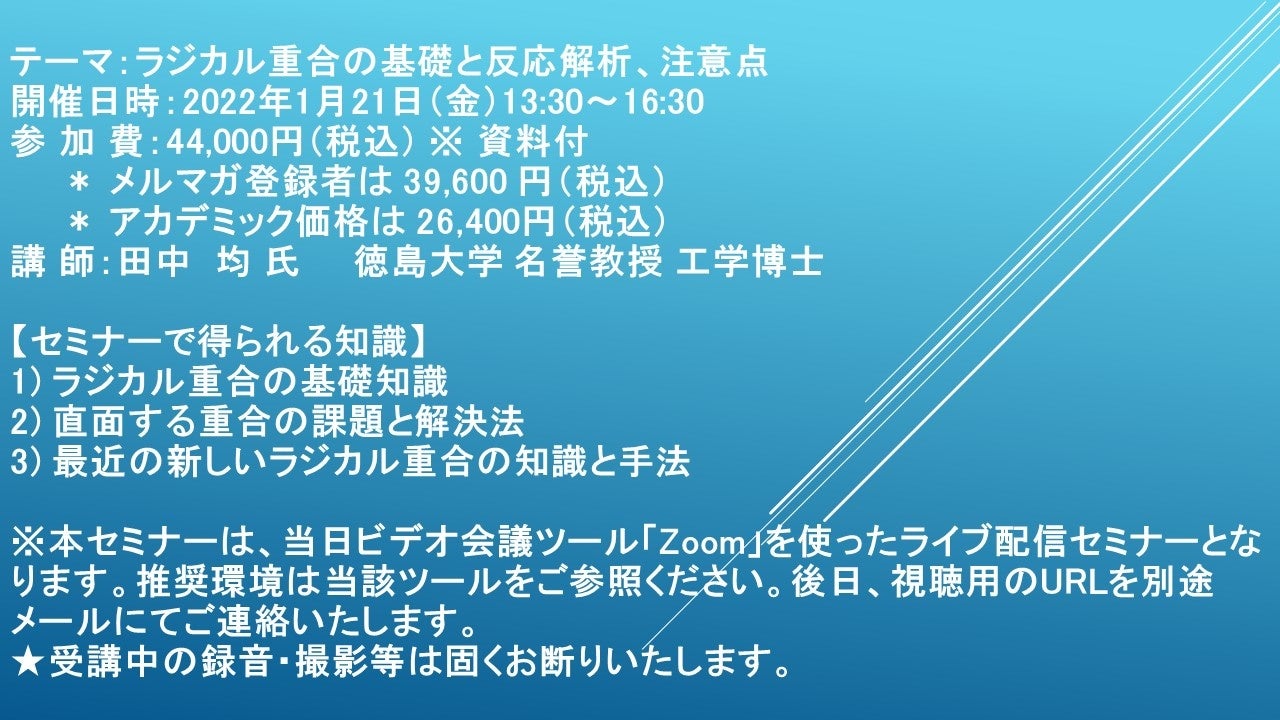 先端技術情報や市場情報を提供している(株)シーエムシー・リサーチ(千代田区神田錦町: https://cmcre.com/ )では、 各種材料・化学品などの市場動向・技術動向のセミナーや書籍発行を行っておりますが、 このたび「ラジカル重合の基礎と反応解析、注意点」と題するセミナーを、 講師に田中 均 氏 徳島大学 名誉教授 工学博士)をお迎えし、2022年1月21日(金)13:30より、 ZOOMを利用したライブ配信で開催いたします。 受講料は、 一般:44,000円(税込)、 弊社メルマガ会員:39,600 円(税込)、 アカデミック価格は26,400円(税込)となっております(資料付)。