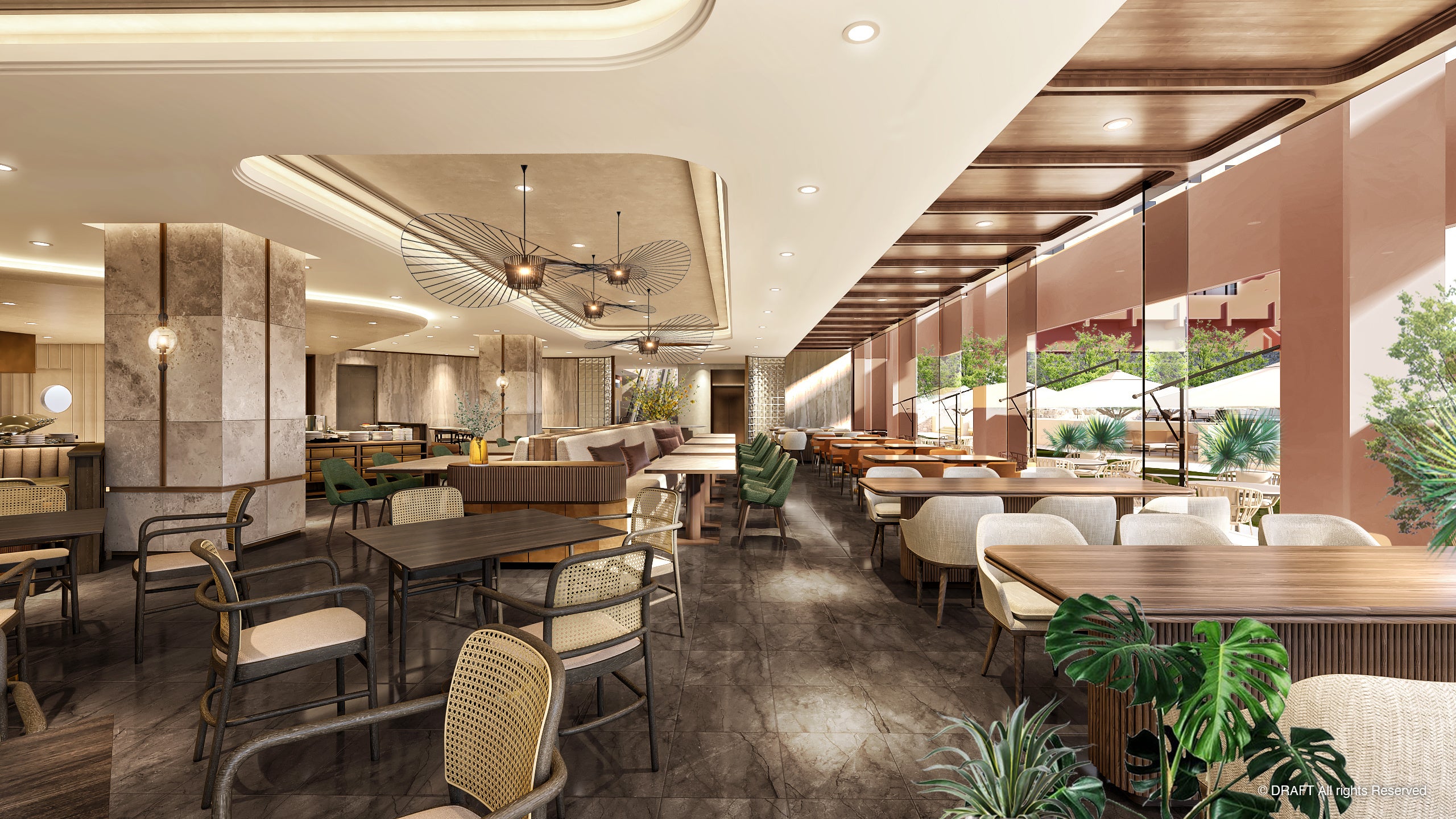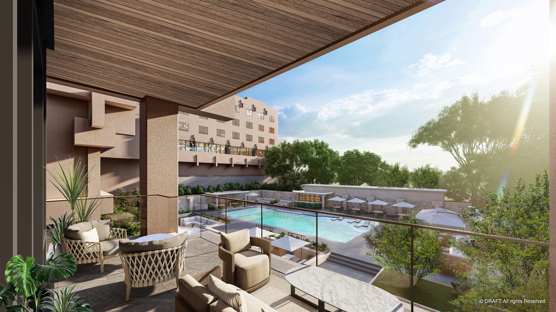 館内は落ち着いたトーンのカラーで統一。ロビーエリアに一歩踏み入れたその瞬間から、優雅で上質な雰囲気がお客様を優しく包み込みます。ロビーラウンジの眼下に広がるガーデンプールはエリアを拡張。水と植栽の鮮やかなコントラストに彩られた開放的な空間は、都心にありながらリゾート感に包まれる魅力的なエリアへと生まれ変わります。また、プールサイドバーも新設し、1年を通してデイタイムからナイトタイムまでゆったり贅沢な時間をお過ごしいただけます。