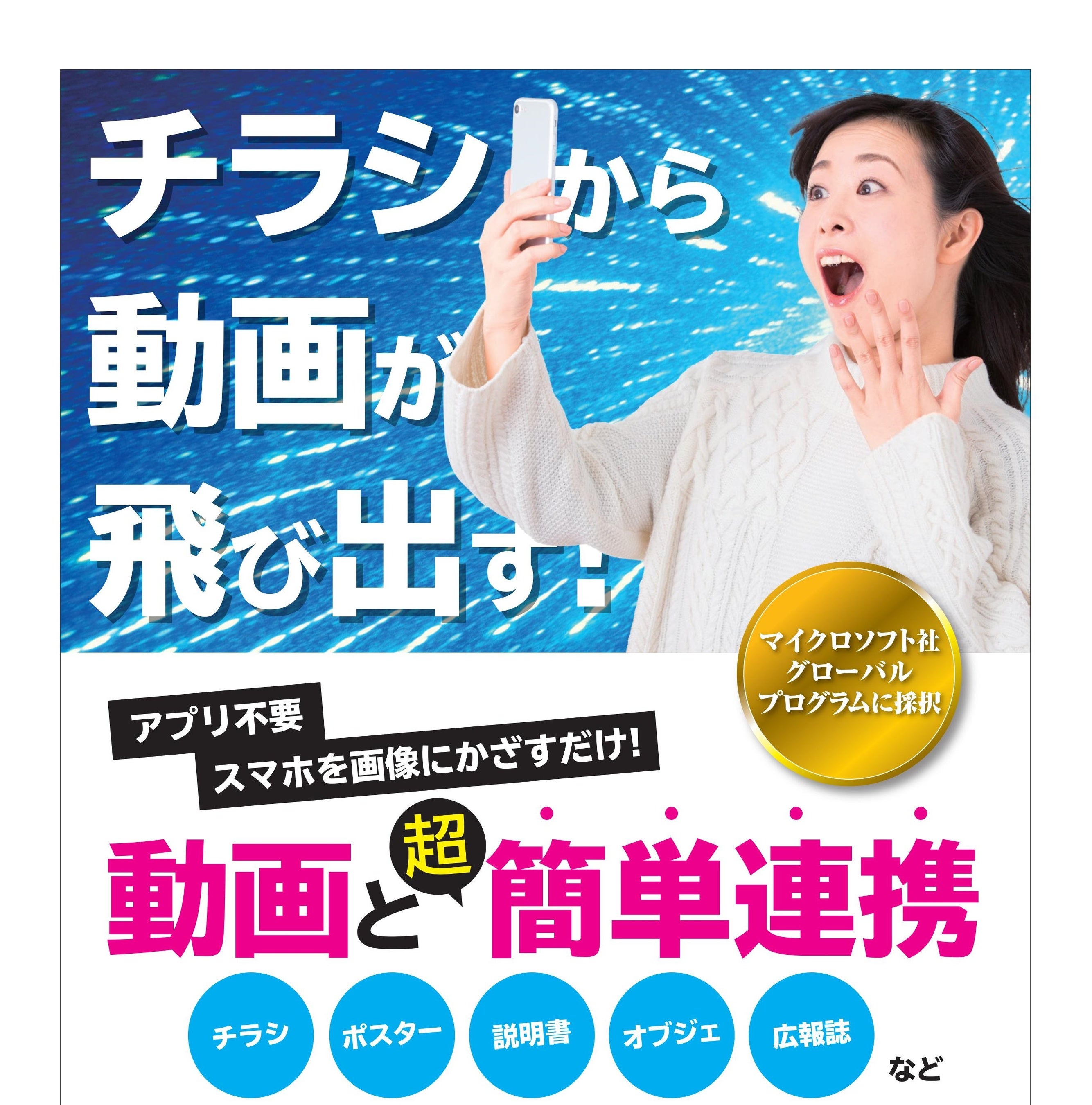 モーションペイパとは「動く紙」を意味するAR技術で、スマートフォンのカメラ機能で二次元コードを読み込んだ後、ポスターなどの紙媒体にかざすと動画が流れたり、指定されたURLに遷移させたりすることができます。専用アプリをスマホにダウンロードしなくても良いことや、1つの二次元コードを読み込むだけで紙媒体上の複数の動画を再生できることが大きな特徴です。