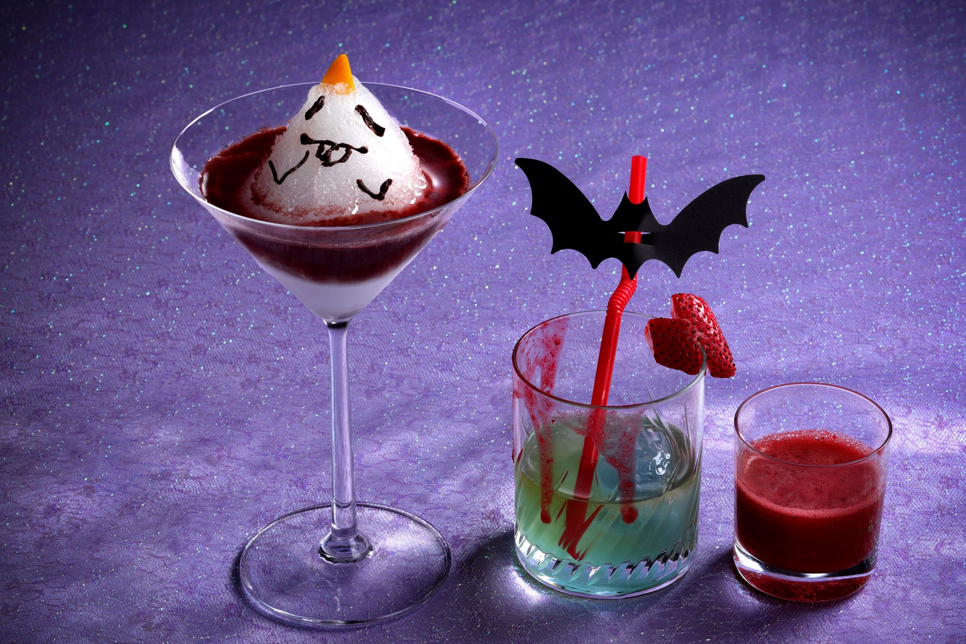 美しいブルーが魅惑的なフルーツリキュール「ヒプノティック」にブランデーを加えるとグリーンに変化し、血に見立てたベリーシロップを加えると真っ赤に染まる、色と味の変化が楽しめるカクテルです。