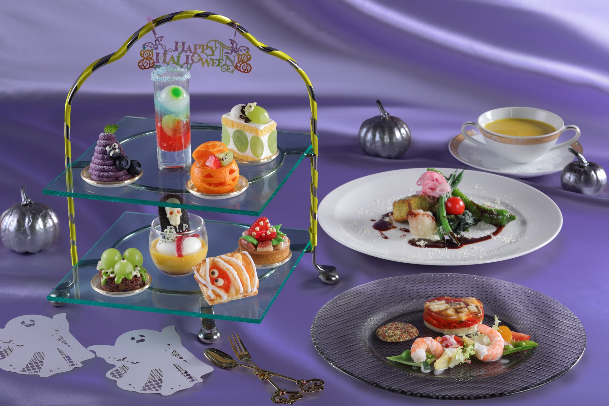 目玉が浮かぶぶどうのゼリーや墓場をイメージしたパンプキンプリンなどを高級フルーツ「シャインマスカット」や秋の味覚「いも・くり・なんきん」を使用し、カラフルでかわいいハロウィーンスイーツに仕上げました。クモの巣に見立てたチュイルや目玉が付いたシャインマスカットをあしらったハロウィーン仕様のセイボリーとともにお楽しみください。