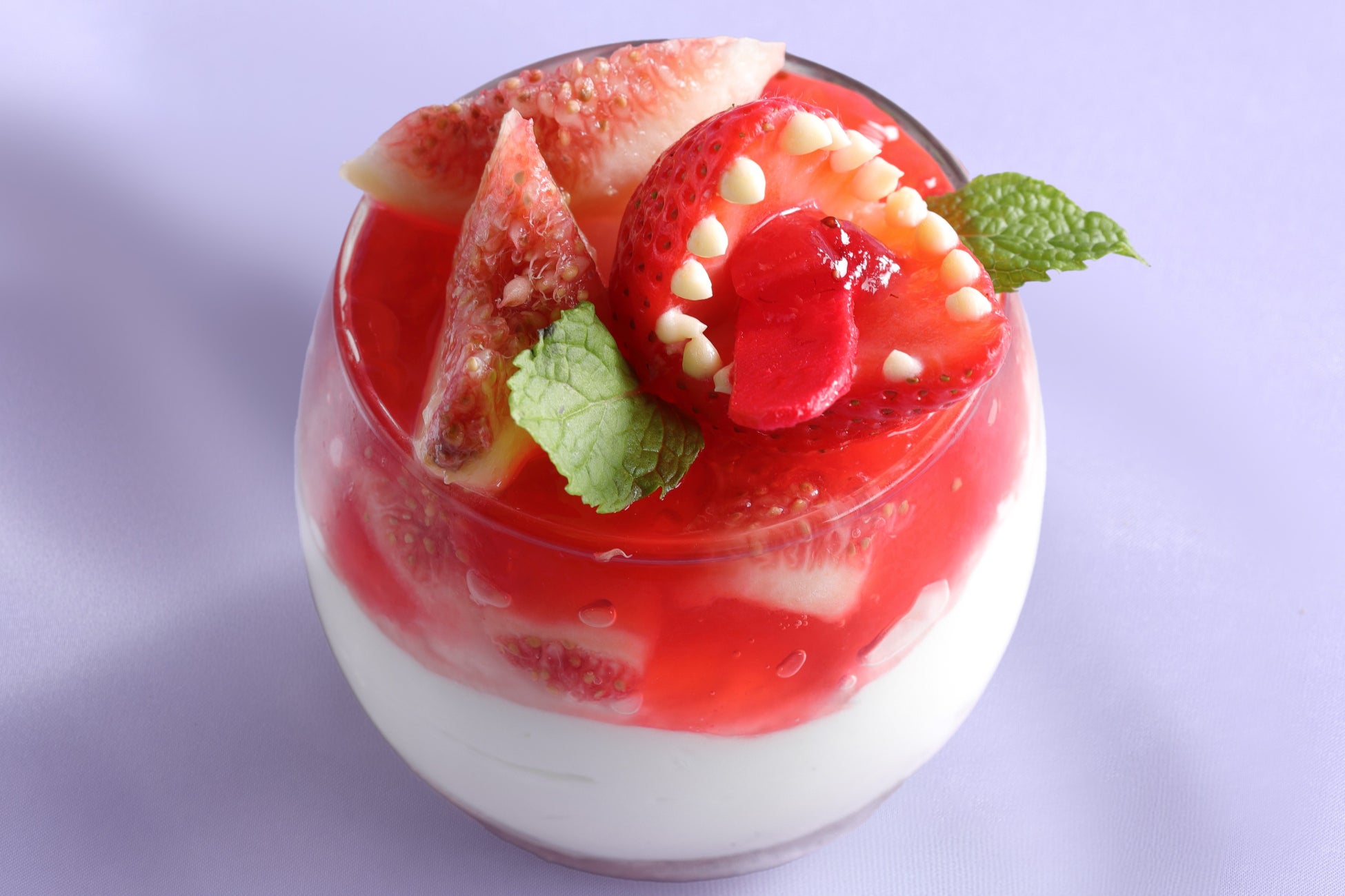 赤ワインシロップを染み込ませたサバランの上に、マスカルポーネのムース、いちじくのコンポートといちごのジュレを重ね、モンスターの口に見立てたいちごをトッピングしました。