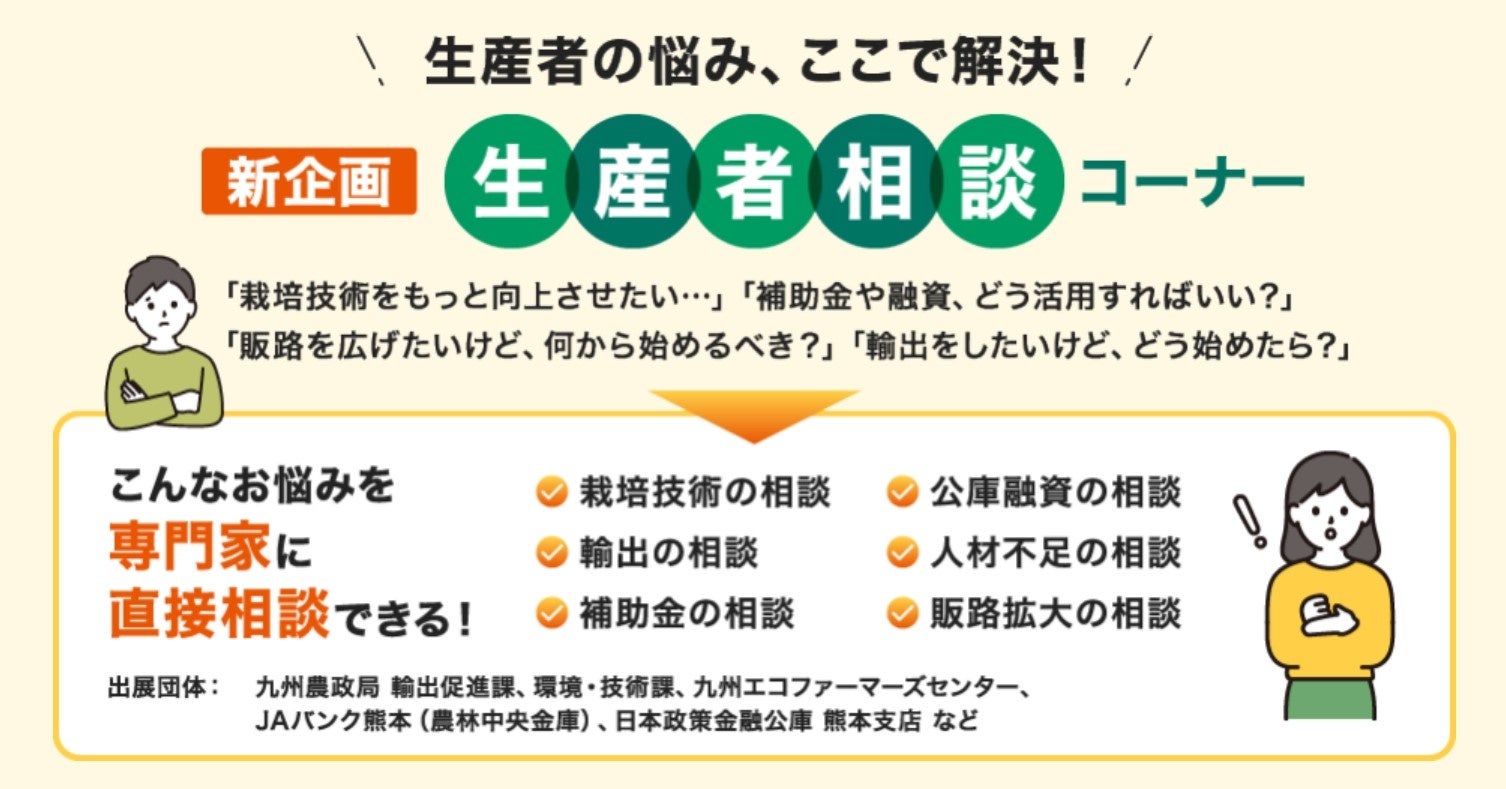 また今回新企画として、栽培技術の相談、補助金や融資から農業経営に関することまで生産者が抱える悩みを専門家に直接相談できる「生産者相談コーナー」を会場内に設置。