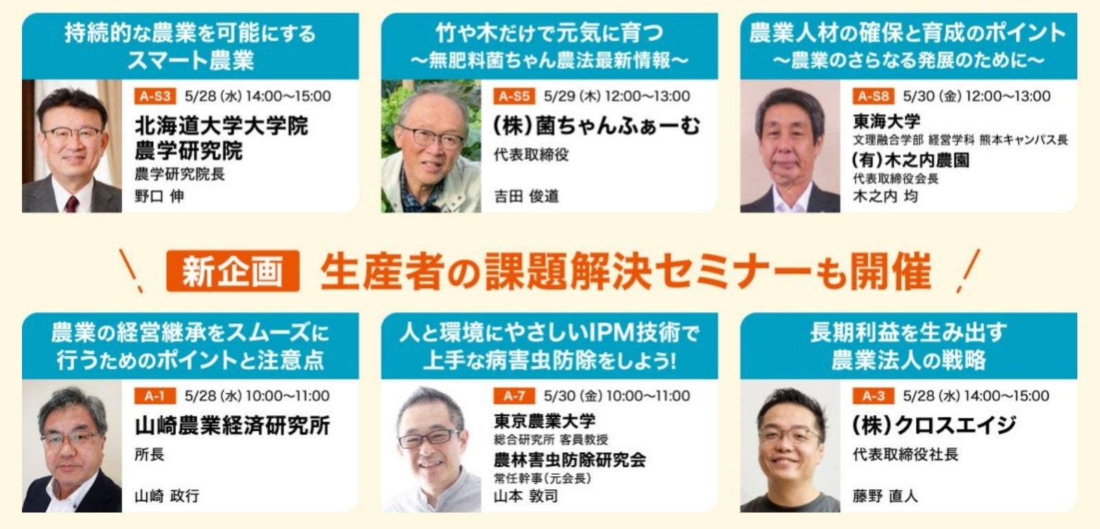 展示会と併催のセミナーでは、スマート農業の第一人者である北海道大学の野口 伸 農学研究院長や、”菌ちゃん先生”として全国に多くのファンを持つ株式会社菌ちゃんふぁーむの吉田 俊道氏など、農業に関する幅広いテーマで開催。新企画の「生産者の課題解決セミナー」では、経営継承や病害虫防除、高温対策など、より生産者の具体的な課題に沿ったテーマで開催します。
