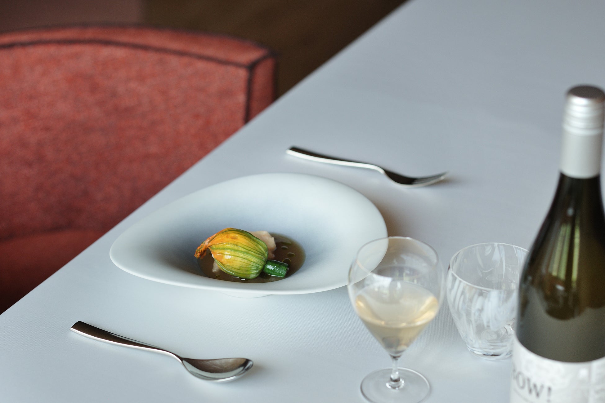 夏に旬を迎える花ズッキーニで岩魚を包み、ふっくらと蒸し上げました。香ばしくフリットにした岩魚を添えて提供するため、異なる食感を楽しめます。仕上げに注がれる川海老の出汁が岩魚の旨味をさらに引き立てます。