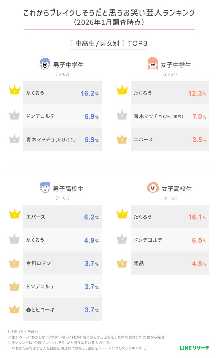 これからブレイクしそうだと思うお笑い芸人の全体の1位は「たくろう」で、男子高校生以外のすべての層で1位となりました。