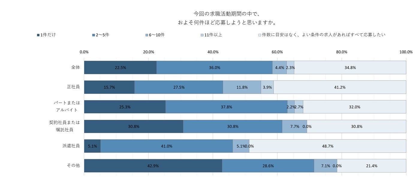 「2~5件」36.0%、「件数に目安はなく、よい条件があれはすべて応募したい」34.8%、「1件だけ」22.5%
