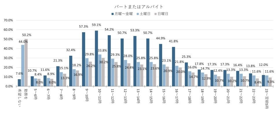 「土曜日」と「日曜日」で勤務を希望する時間帯は、9時から17時までで2割から3割となっている。「勤務を希望しない」は「土曜日」で4割超、「日曜日」で5割程度となっている。約半数は、土日の勤務は避けたい意向のようだ。