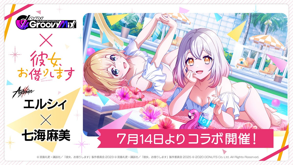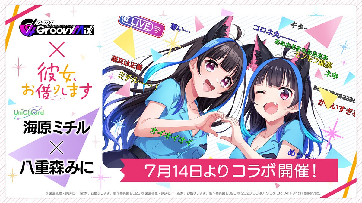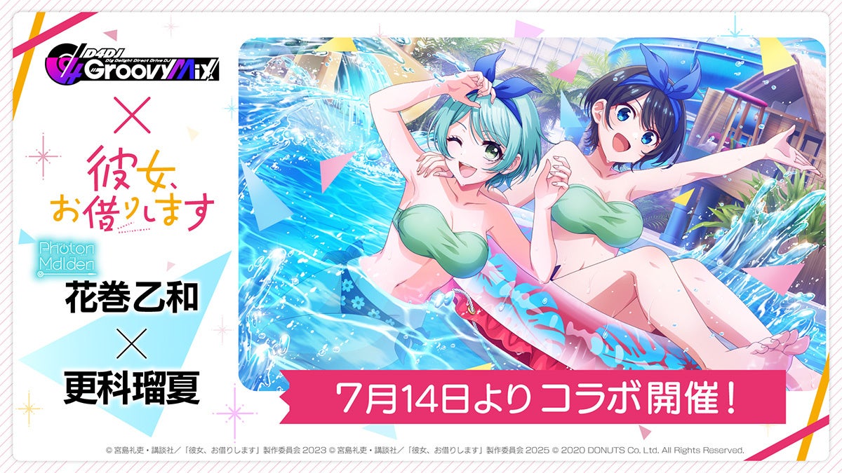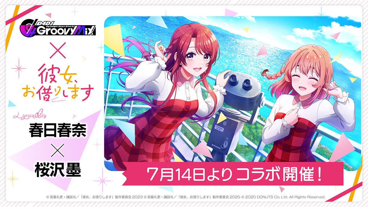 株式会社DONUTS(東京都渋谷区、代表取締役:西村啓成)は、スマートフォン向けリズムゲーム「D4DJ Groovy Mix」(以下グルミク)にて、TVアニメ『彼女、お借りします』とのコラボイベント&ガチャ「DJ、お借りします」を7月14日(月)12:00より開始いたします。