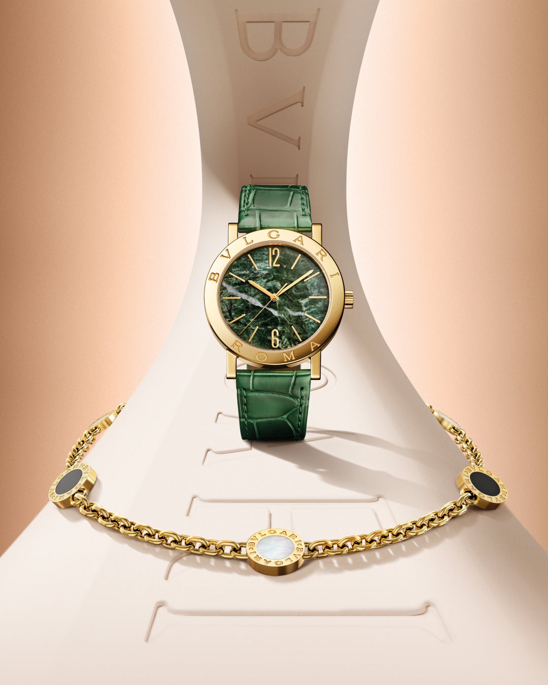 古代ローマの硬貨に着想を得た「ブルガリ・ブルガリ」のベゼルには、ブルガリの名が大胆に刻まれ、唯一無二のアイデンティティを主張しています。1934年にコンドッティ通りの旗艦店改装時に採用された、特徴的なローマ様式のタイポグラフィは、それ以降ブランドの象徴となっています。刻印に限らずウォッチのデザインは永遠の都ローマの視覚言語から深く影響を受けており、シルエットは古代ギリシャ・ローマのパンテオンの大理石の柱やペリスタイルを彷彿とさせます。そして今回の50周年を記念した大理石のダイアルにより、ブルガリはさらなる再解釈を提示します。