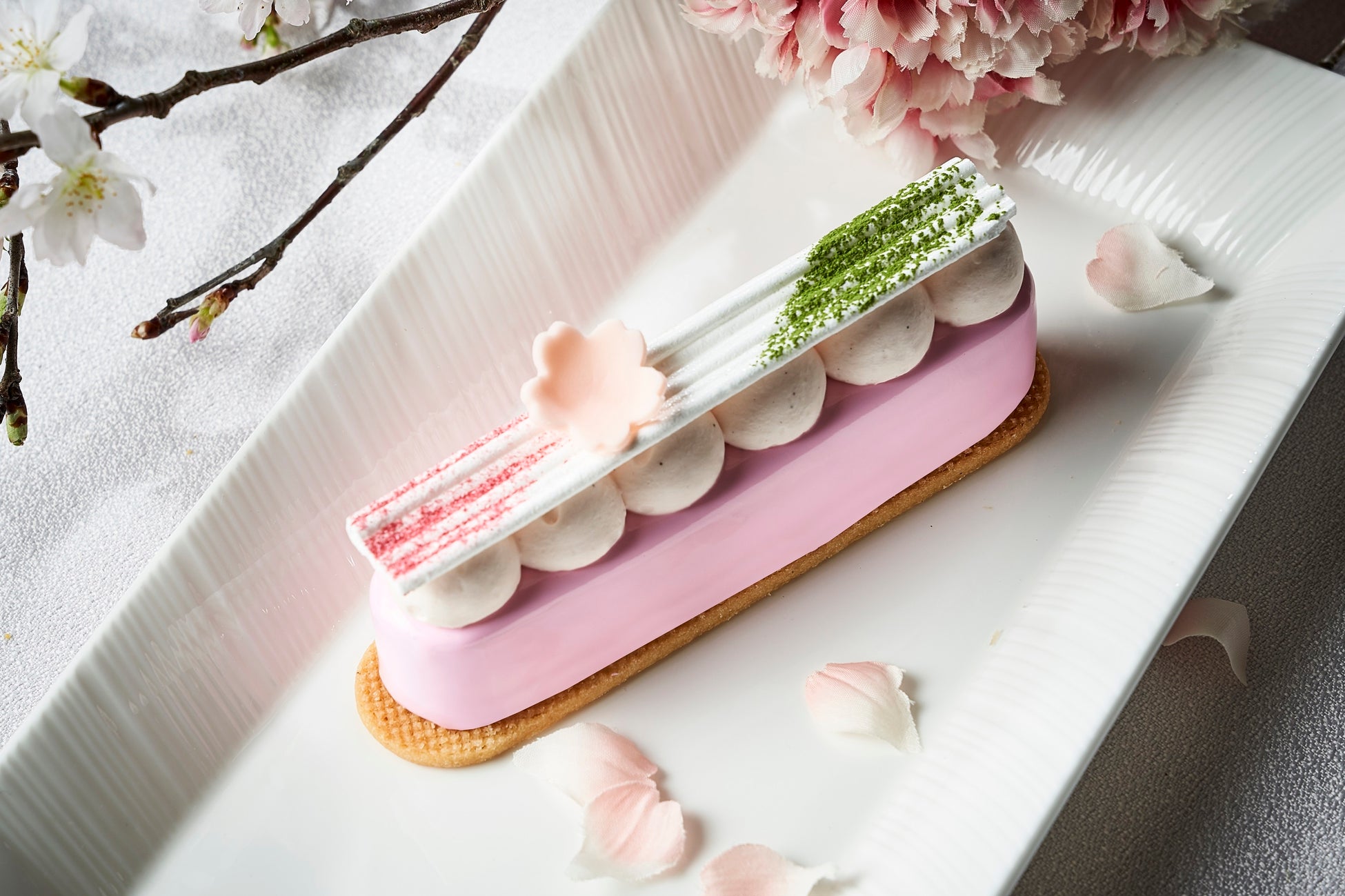 桜の枝をイメージしたエクレアは、見た目だけでなく味わいも独創的。甘く上品な抹茶のクリームに甘酸っぱいストロベリーを合わせ、エレガントで華やかな味わいに。