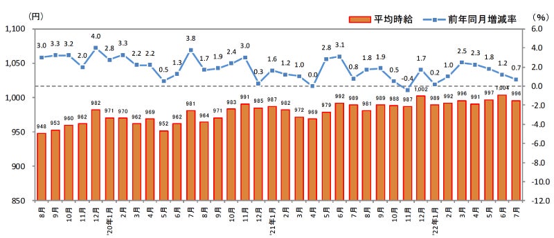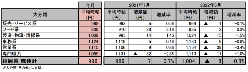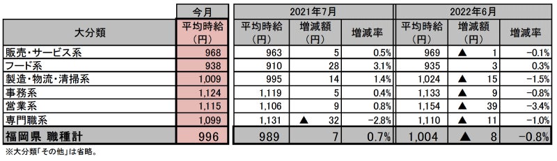 [福岡県版]2022年7月度 アルバイト・パート募集時平均時給調査 福岡県の7月度平均時給は前年同月より7円増加の996円