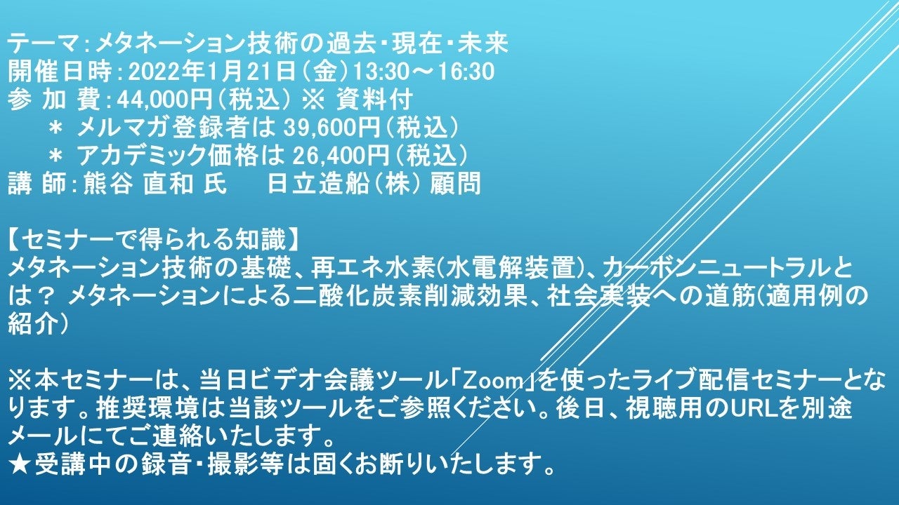 先端技術情報や市場情報を提供している(株)シーエムシー・リサーチ(千代田区神田錦町: https://cmcre.com/ )では、 各種材料・化学品などの市場動向・技術動向のセミナーや書籍発行を行っておりますが、 このたび「メタネーション技術の過去・現在・未来」と題するセミナーを、 講師に熊谷 直和 氏 日立造船(株) 顧問)をお迎えし、2022年1月21日(金)13:30より、 ZOOMを利用したライブ配信で開催いたします。 受講料は、 一般:44,000円(税込)、 弊社メルマガ会員:39,600円(税込)、 アカデミック価格は26,400円(税込)となっております(資料付)。