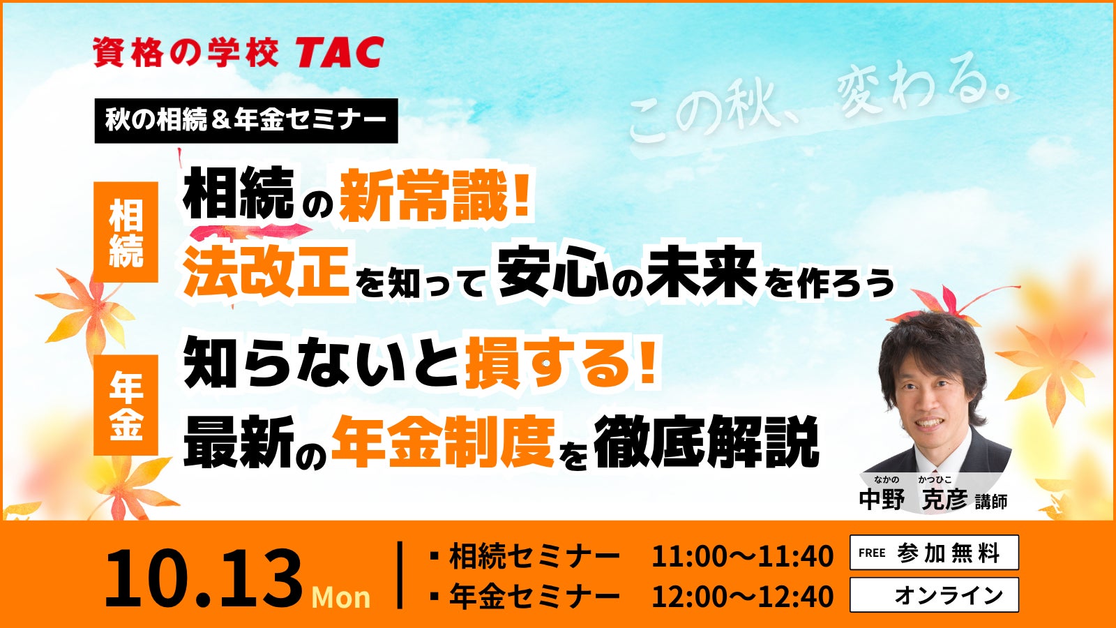 ファイナンシャル・プランナー(以下、FP)、簿記検定試験、税理士、公認会計士などの資格取得に向けた教育サービスを展開しているTAC株式会社(東京都千代田区、代表取締役:多田 敏男)は、人生100年時代に身につけておきたい相続・年金にまつわる”お金の知識”を楽しく学べる「秋の相続・年金セミナー」を2025年10月13日(月祝)に開催します。
