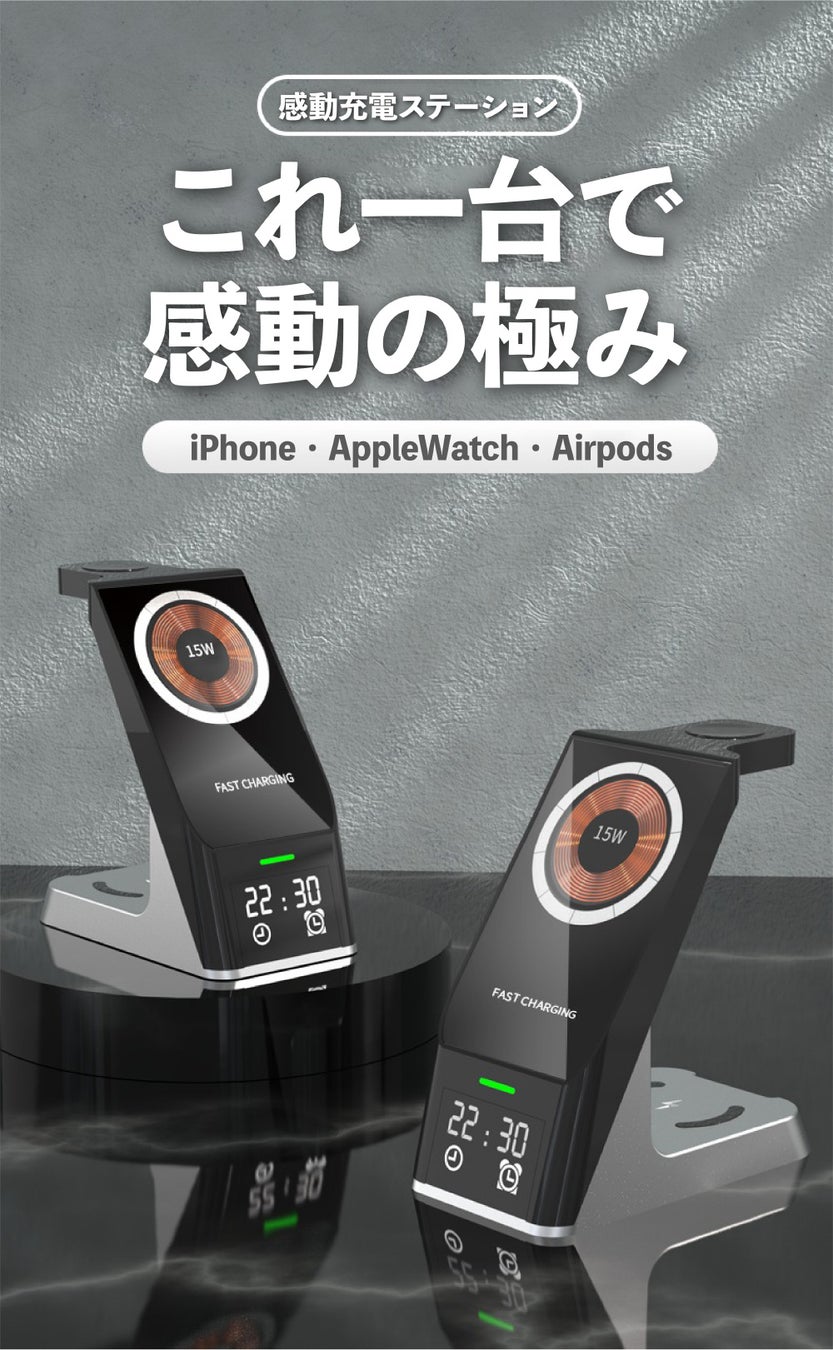 Appleシリーズの主要デバイスが同時に3台充電できるような本体デザインになっており、効率がよく機能性に優れています。