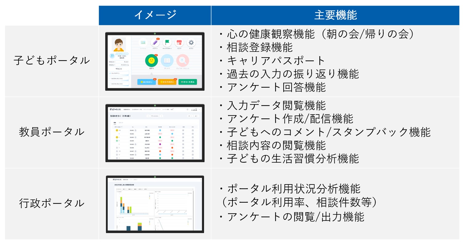 また、本サービスには子ども版・教員版の他に行政版のポータルも備えており、子どものポータル利用率や相談件数の確認、アンケート閲覧などの管理も可能です。