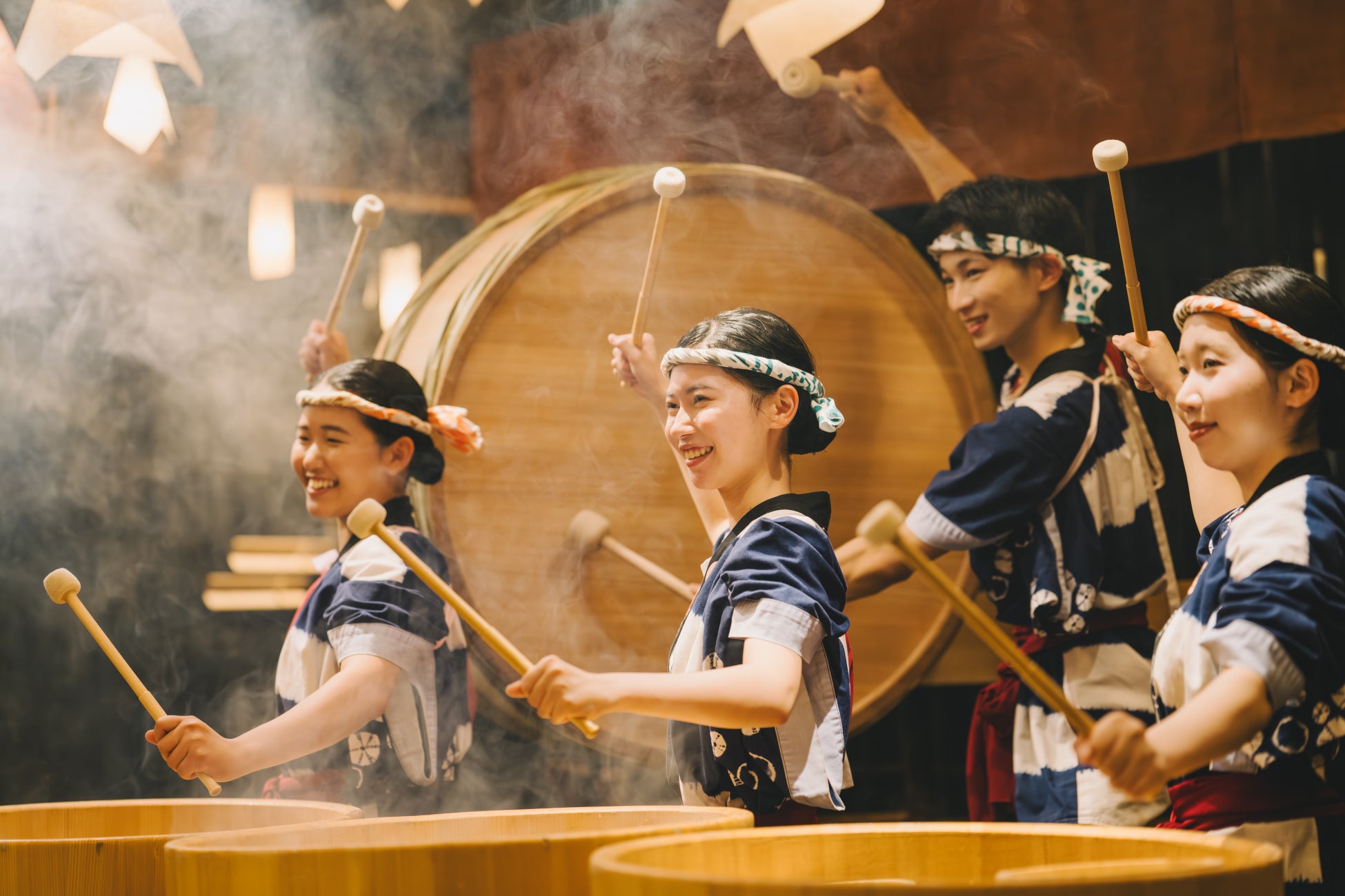 界ブランドが提供する、ご当地の文化を体験する「ご当地楽(がく)」。別府温泉では、かつて別府港が開港し、湯治客で賑わった頃の夜の温泉街が、流しのギター弾きやオールディーズバンドの音色で彩られていた歴史があります。この歴史にちなみ、界 別府の「ご当地楽」では、法被をまとったスタッフが、豊富な温泉と桶からユニークな音色を生み出す「湯治ジャグバンド」を開催しています。期間中は、直径約2mの桶を大太鼓に見立て、約150Lの温泉を使用したダイナミックな演奏を披露。夜の温泉街のクライマックスとして賑わいに華を添え、スタッフとお客様が一体となって盛り上がる、特別な体験です。