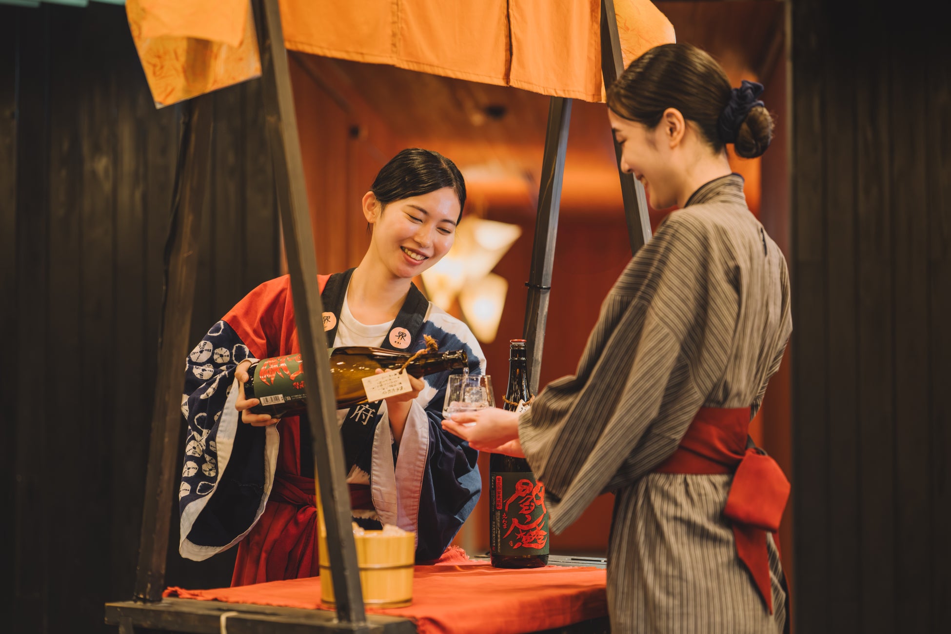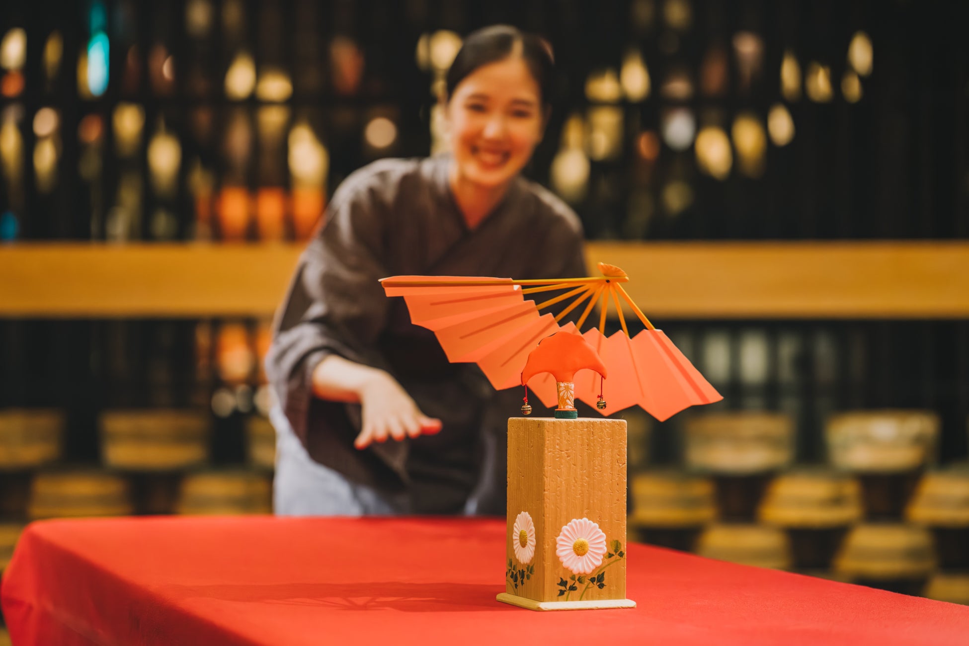 界 別府では、館内の温泉街に見立てたパブリックスペース「湯の広場」には焼酎屋台が登場し、お座敷遊びを楽しめます。焼酎を片手に館内をそぞろ歩きをしながら、かつての別府温泉で親しまれたお座敷遊びに着想を得た、界 別府オリジナルのルールで夜のひとときを満喫できます。宿が位置する北浜エリアは、かつて三味線や舞、そして金毘羅船々(こんぴらふねふね)や狐拳といった遊芸が旅人の夜を彩った場所です。格式よりも親しみを大切にした別府ならではの芸の文化を感じてもらえるよう、扇を投げて得点を競う「投扇興(とうせんきょう)」や、別府音頭に合わせて楽しむ「金毘羅船々」など、湯上がりのひとときを豊かに演出する体験を提供します。