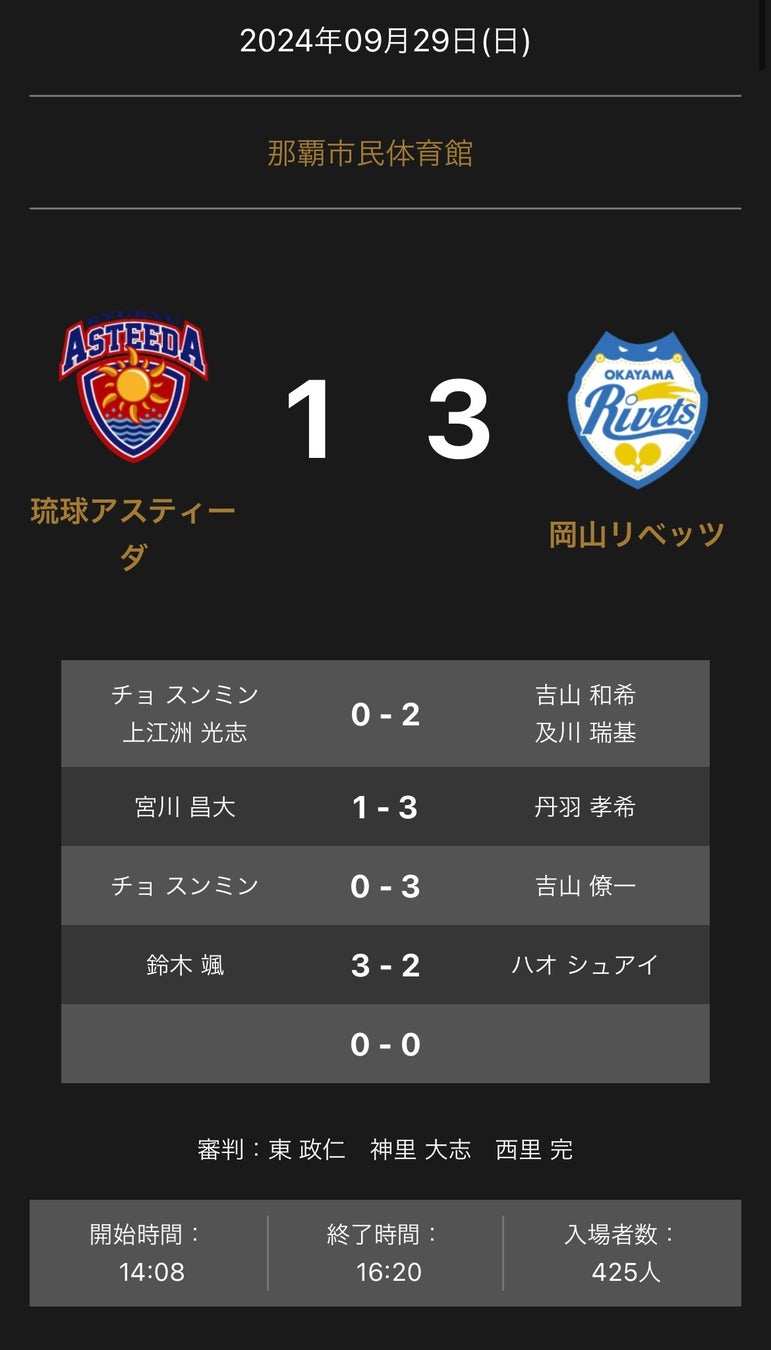 ノジマTリーグ 2024-2025シーズン 公式戦 9月29日開催 琉球アスティーダ vs 岡山リベッツの試合は、3-1で岡山リベッツが勝利しました。