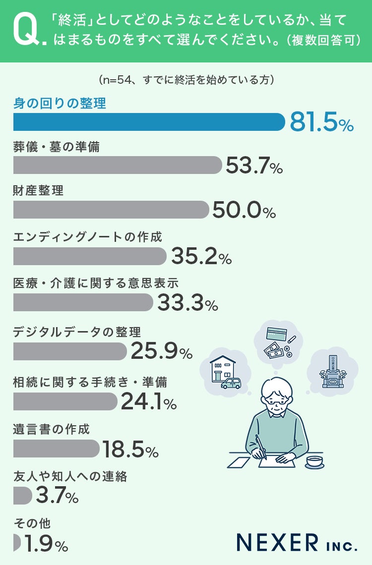 一方で「すでに終活を始めている」と回答した方に、「終活」としてどのようなことをしているか、当てはまるものをすべて選んでもらいました。