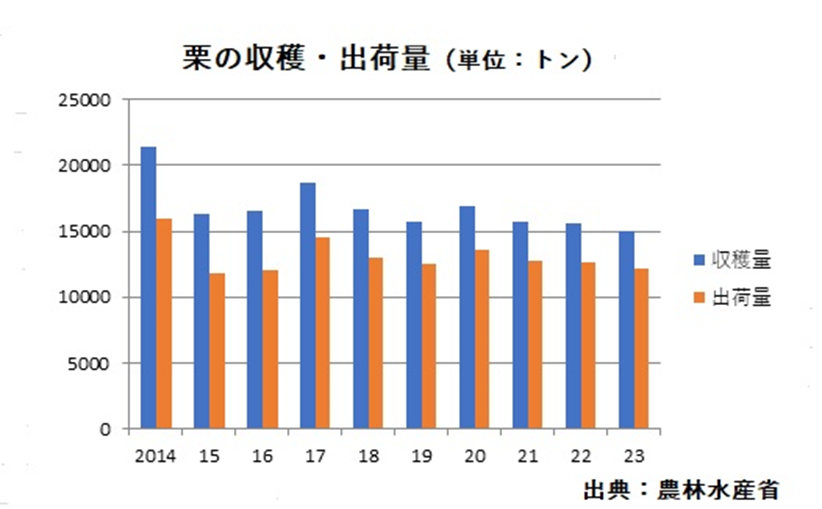 農林水産省の作物統計調査によると、2023年(令和5年)度の栗の収穫量は1万5,000トン、出荷量は1万2,200トン。いずれも前年比は4%減っていますが、過去10年間の実績を見ると、グラフのように比較的安定して推移しています。