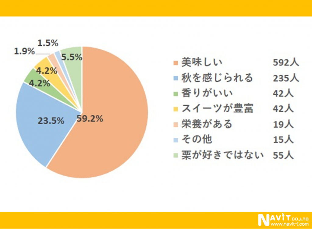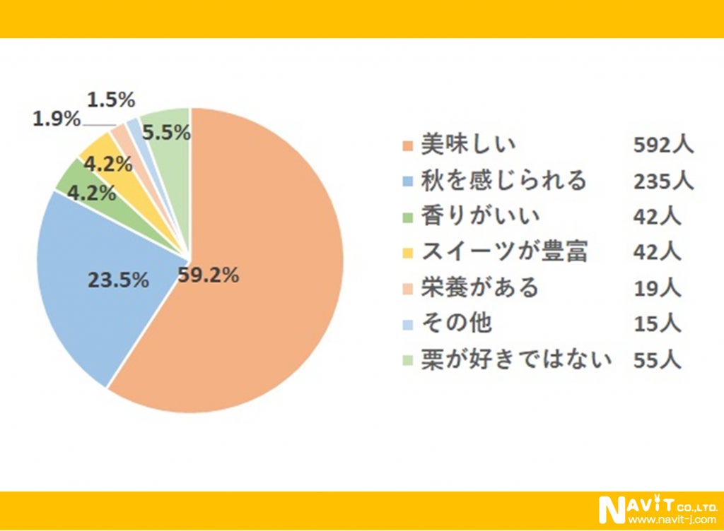 栗の魅力については「美味しい」がトップで592人。2位が「秋を感じられる」で235人でした。