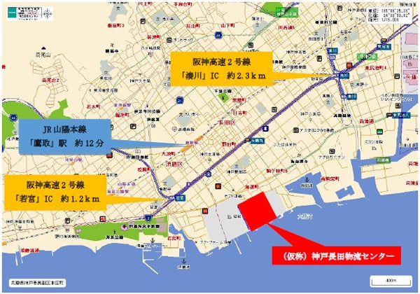 「(仮称)神戸長田物流センター」は、阪神高速3号神戸線「若宮インターチェンジ」から約2.1km、「湊川インターチェンジ」から約2.3kmと近畿エリアから広域には中国地方や四国地方への配送拠点としても対応可能な場所に位置しています。