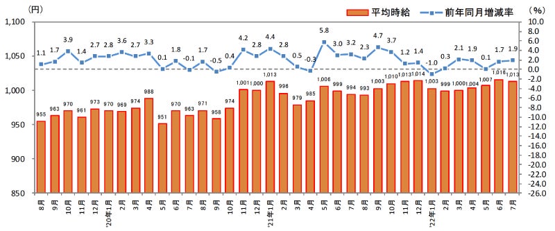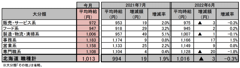[北海道版]2022年7月度 アルバイト・パート募集時平均時給調査 北海道の7月度平均時給は前年同月より19円増加の1,013円