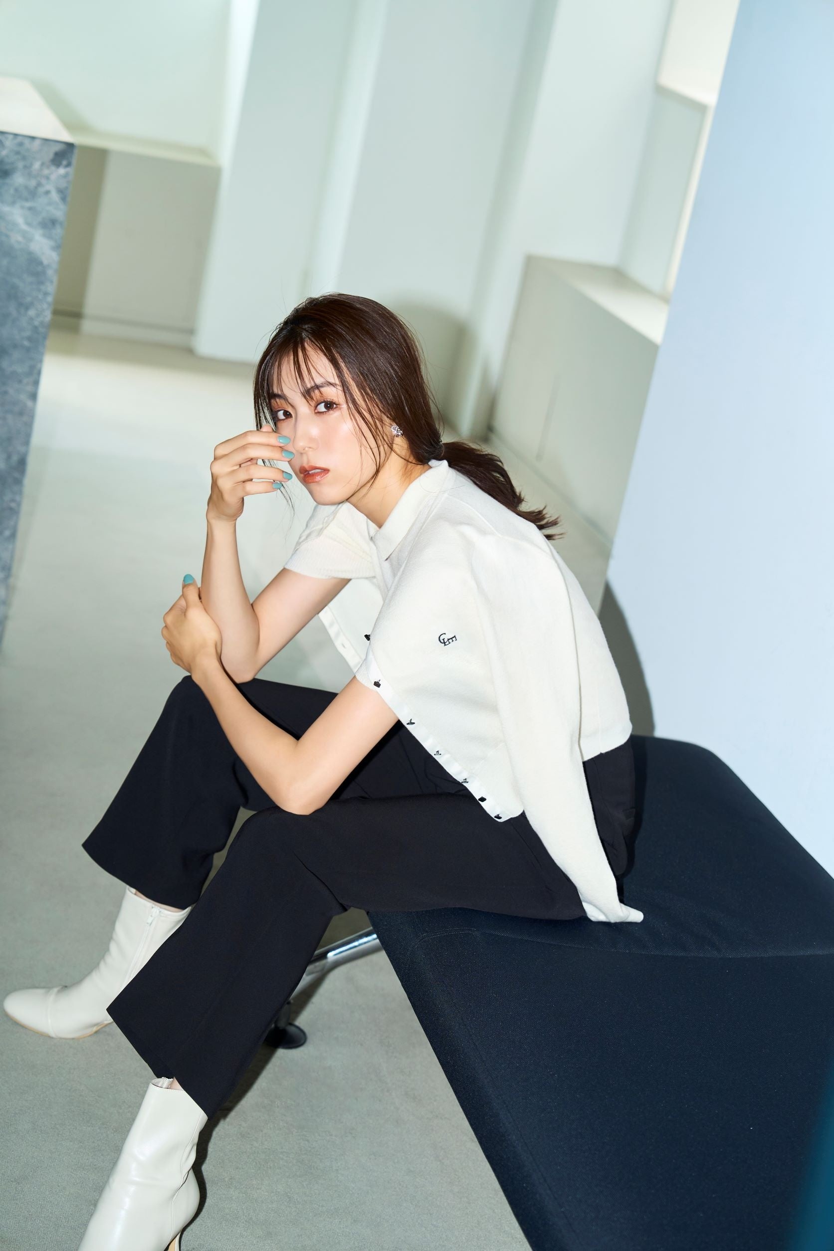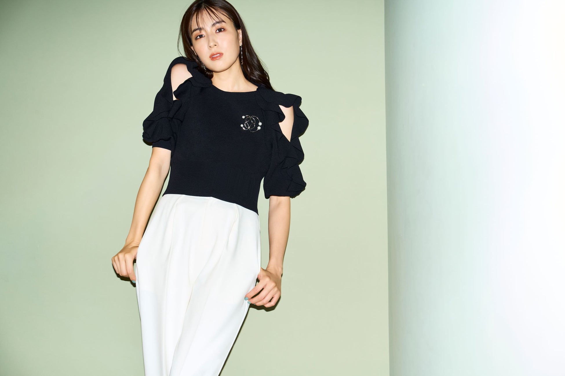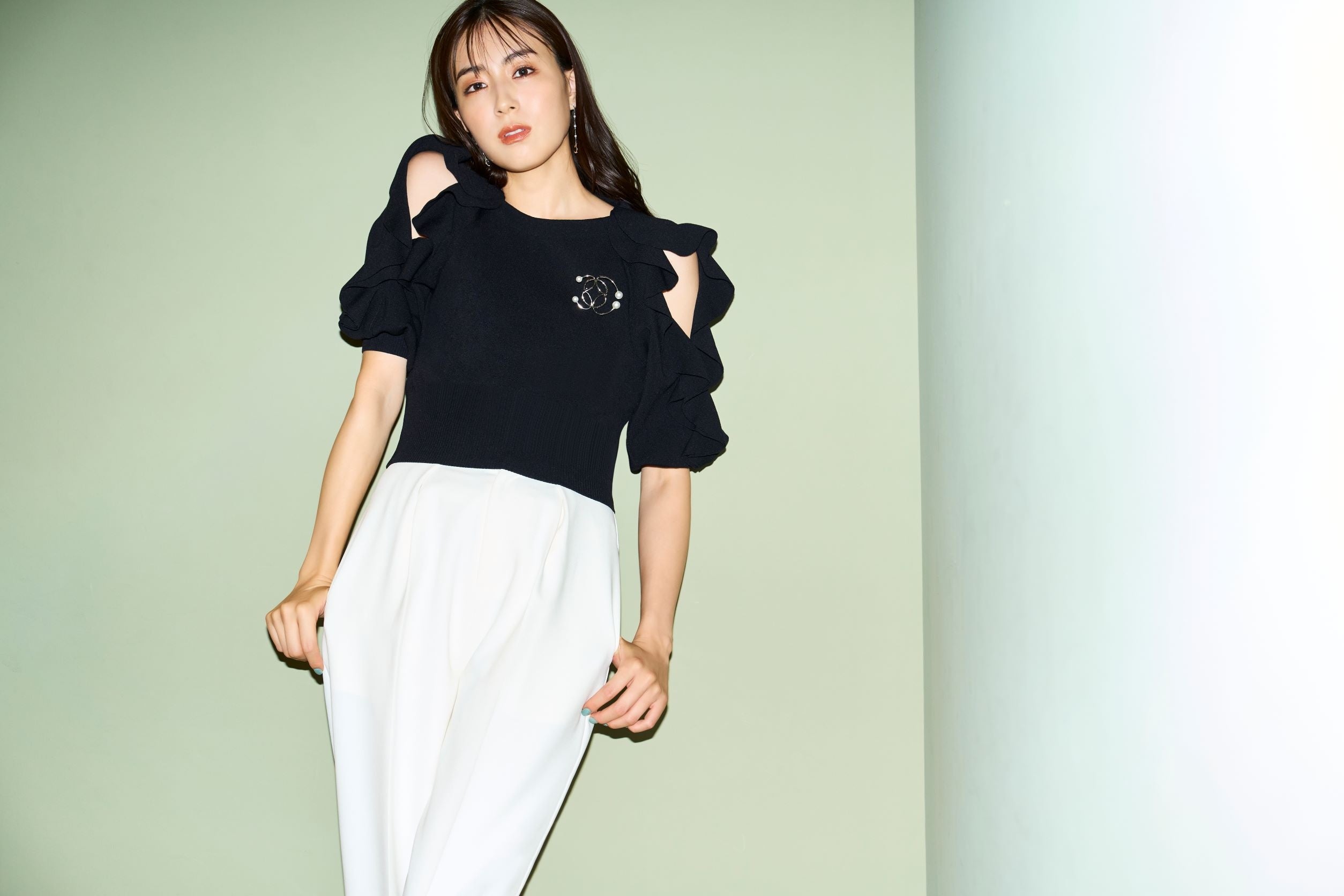 「ヘアメイクさんとも話していたのですが、CELFORDのパワショル系のトップスって肩の入り方が独特で、モード派や辛口系が好きな人にもファンが多いのがよくわかります。オケージョンシーンにもかっこよく映える、いいとこ取りのニットとスカート」
