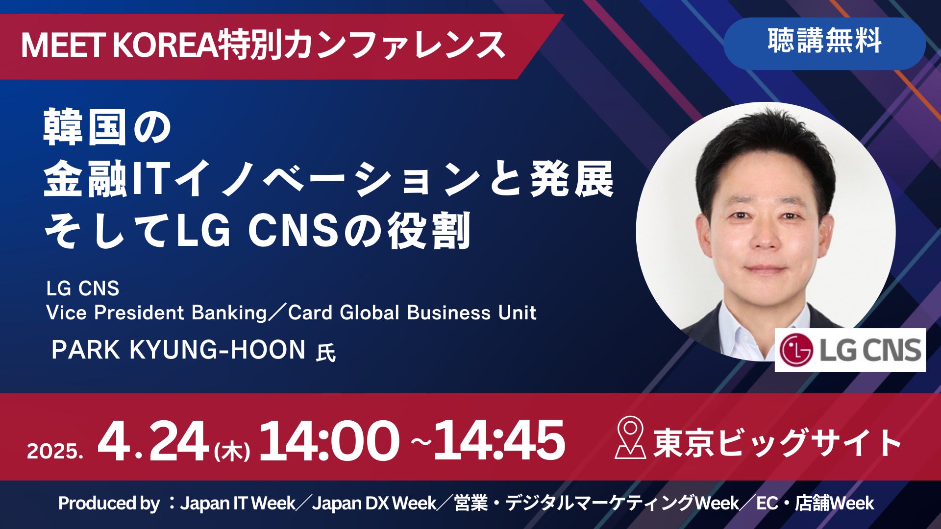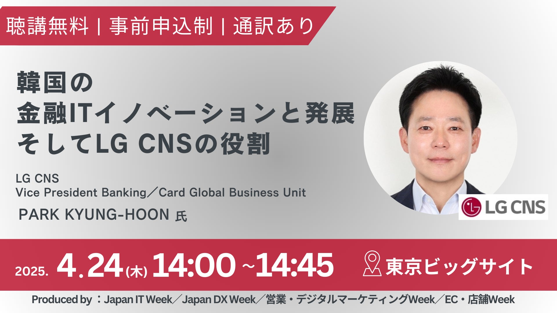 RX Japan株式会社(本社:東京都中央区、代表取締役社長:田中 岳志)は2025年4月23日(水)~25日(金)の3日間、950社*が出展する日本最大級のIT・DXの総合展内 特別企画として「MEET KOREA」を初開催。その中で、韓国を代表するIT企業・LG CNS社による特別講演を実施する。 [※事前申込制。定員になり次第、締切]