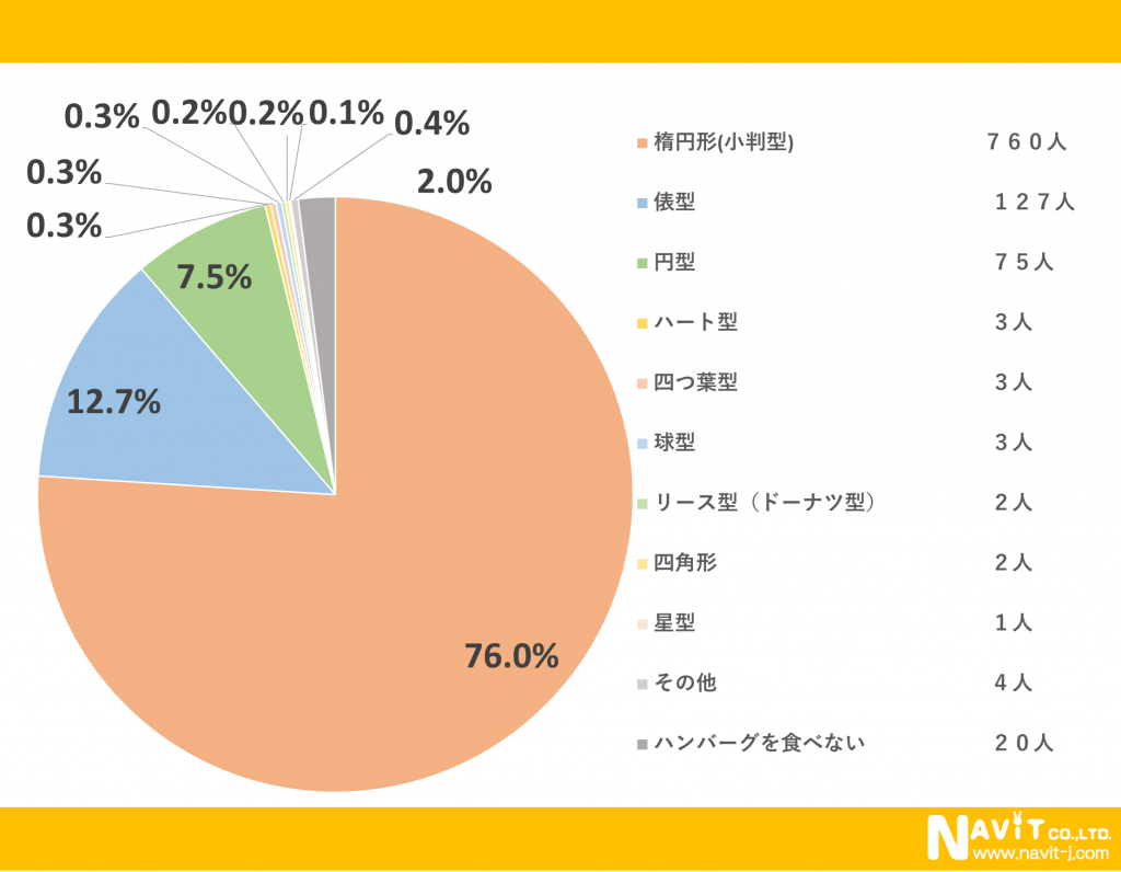 ハンバーグには色んな形がありますが、どの形が人気なのかというアンケートでは「楕円形(小判形)」が1番多く76.0%の人が選びました。次に多かったのは「俵形」で12.7%で「円形」が7.5%という結果になりました。