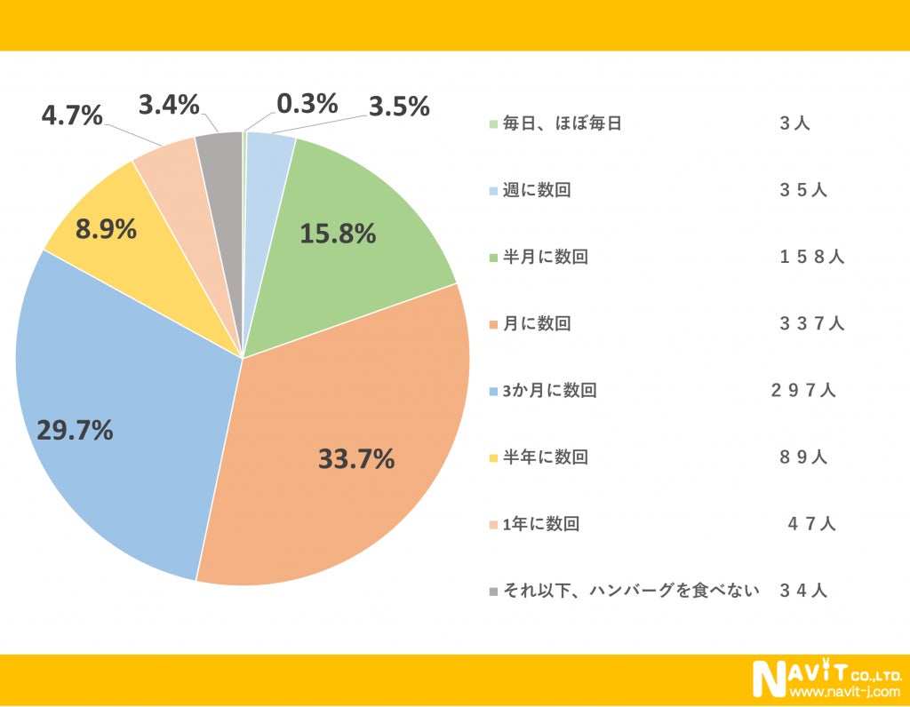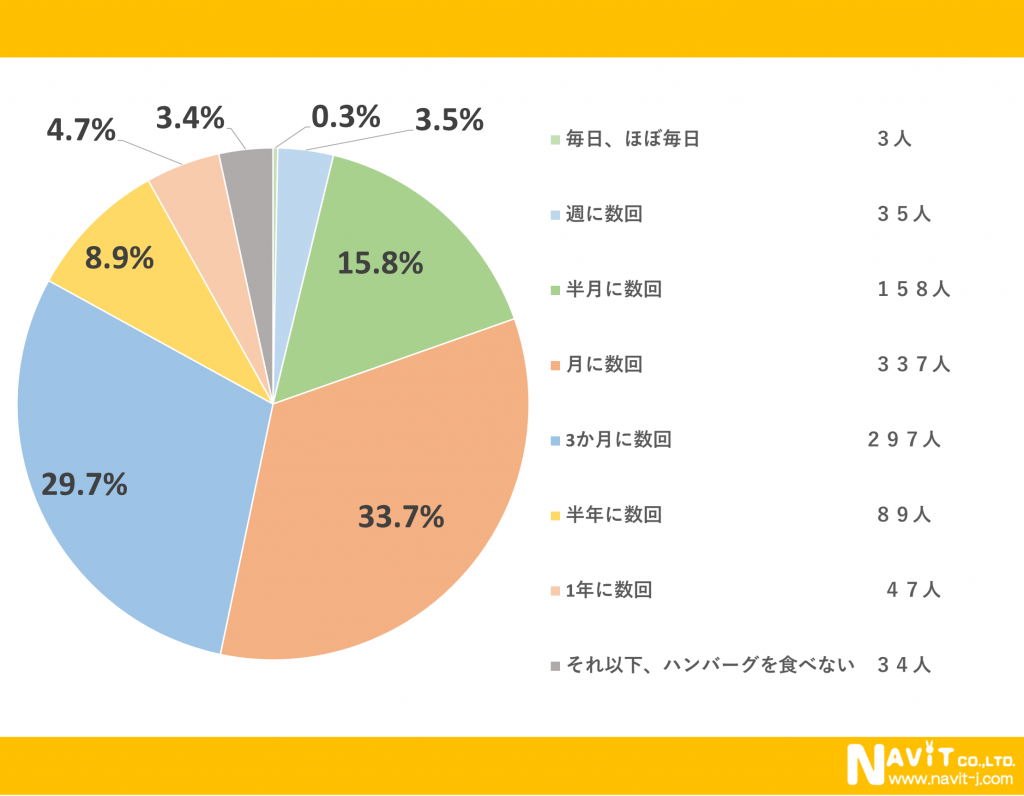 ハンバーグを「毎日、ほぼ毎日」食べるという人も0.3%いらっしゃいますが、1番多かったのは「月に数回」で33.7%という結果になりました。次に多かったのは「3か月に数回」で29.7%という結果になりました。