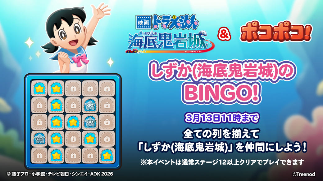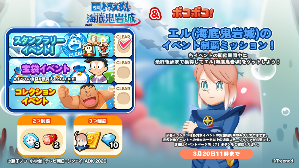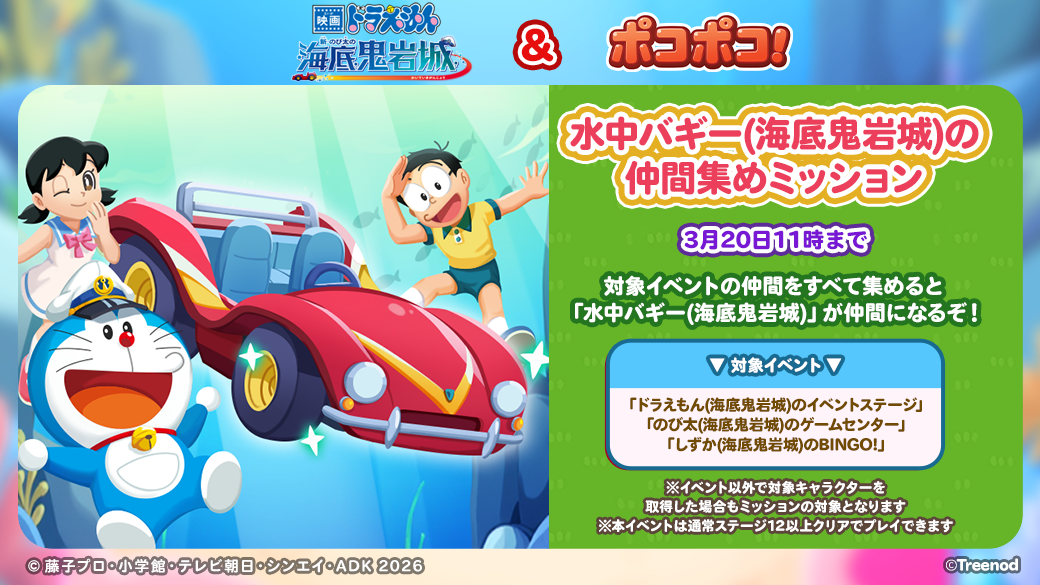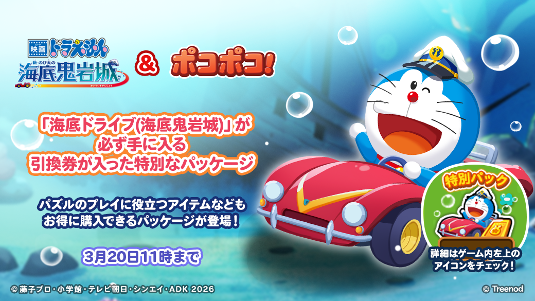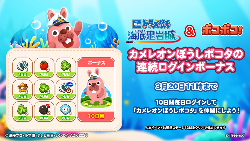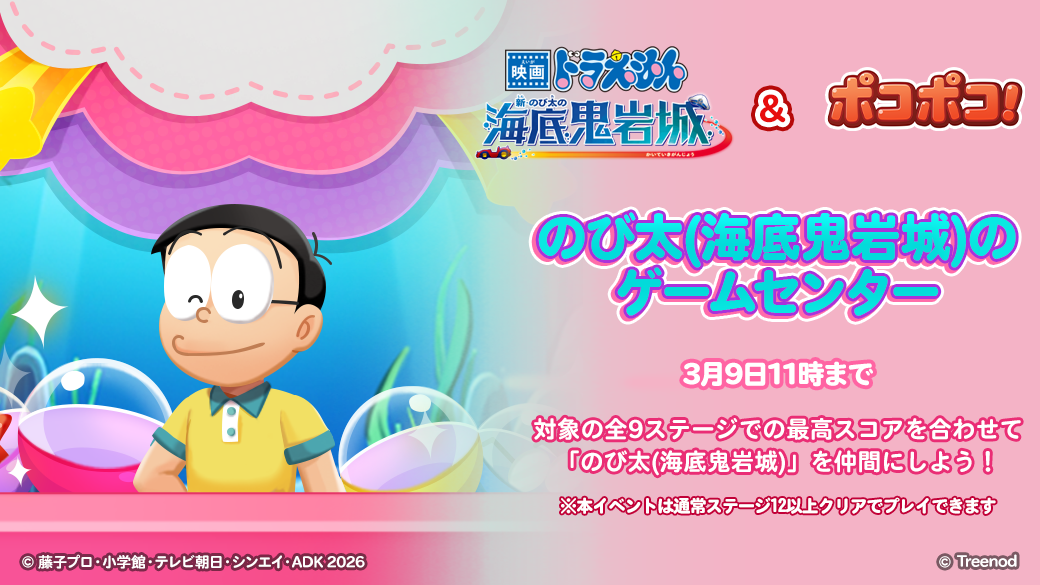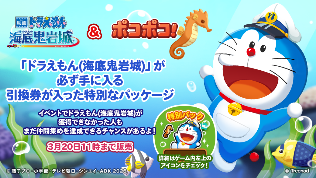 LINEヤフー株式会社は、当社が展開する3マッチパズルゲーム「LINE ポコポコ」(iPhone・Android対応/無料)において、『映画ドラえもん 新・のび太の海底鬼岩城』記念イベントを、2026年2月27日(金)より開催します。
