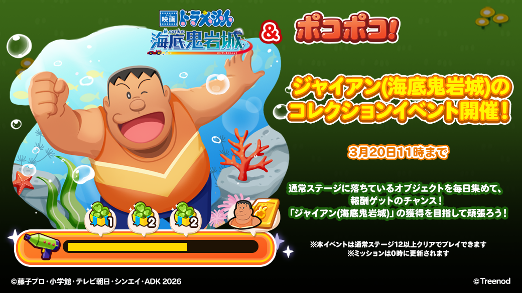 期間中、指定のステージを一定以上のスコアでクリアすると、オブジェクトが獲得できます。オブジェクトを集めると、限定仲間「ジャイアン(海底鬼岩城)」がもらえます。