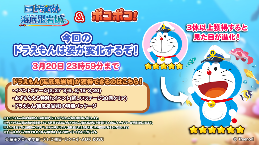 期間中、新しいステージを30個以上クリアすると、「ドラえもん(海底鬼岩城)」を必ず獲得できるイベントを開催します。