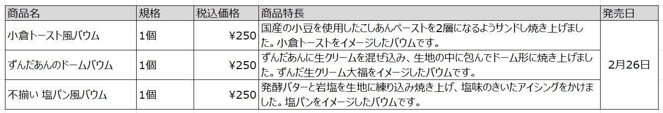 新商品の発売を記念して、下記5店舗で先行試食イベントを開催します。お客さまに長年ご好評をいただいているバウムの新たな魅力を知っていただく機会となります。イベントではバウムとの相性を考えた、ペアリングドリンクもご提供予定で、詳細は各店舗ページにて、2月5日(水)以降、順次公開します。