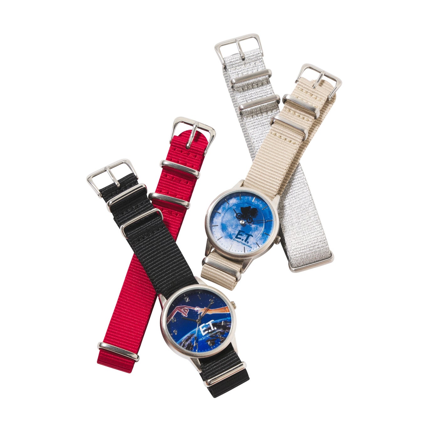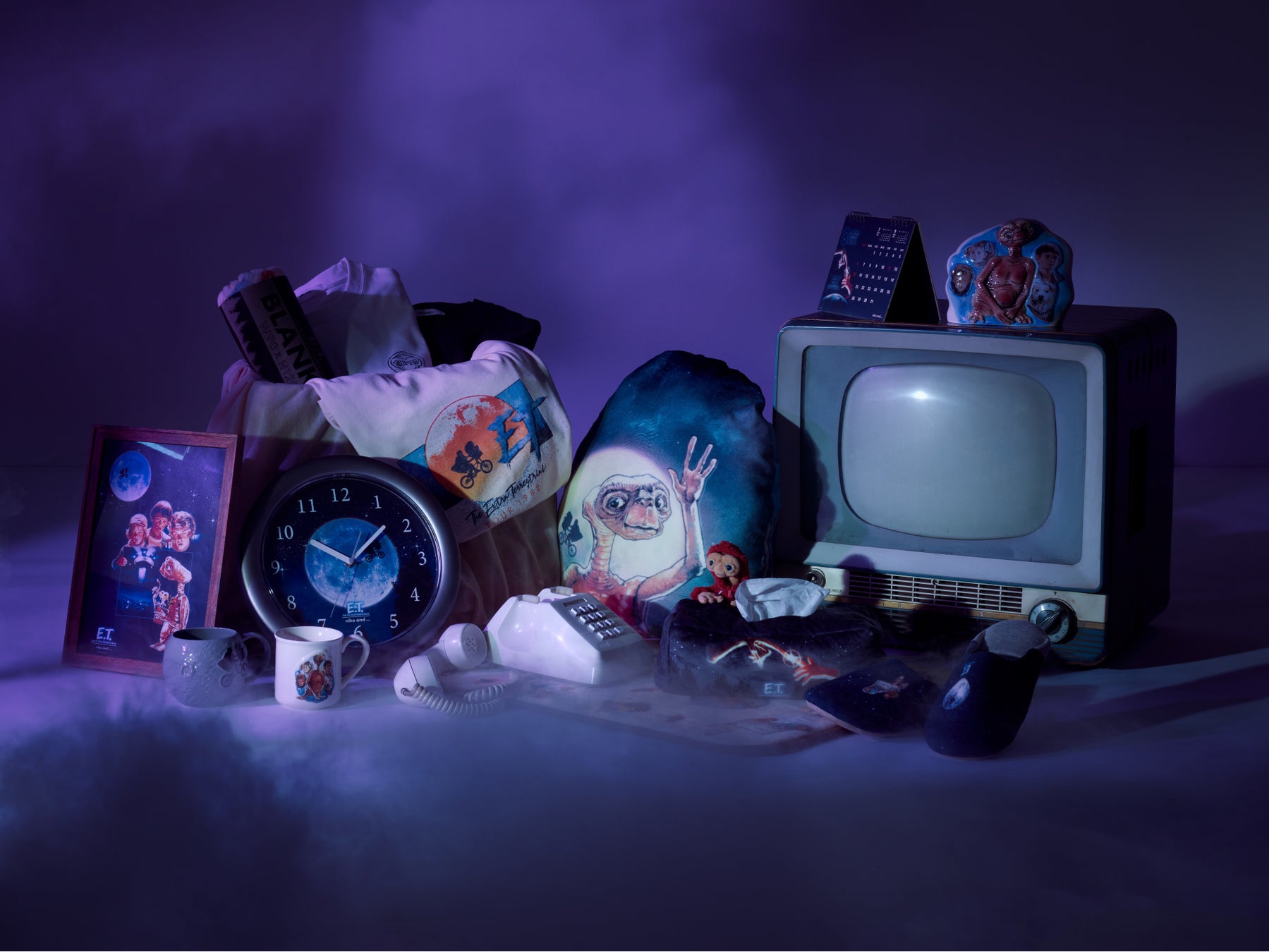 コラボアイテムは、クッションやアクセサリートレーなどの雑貨とウィメンズのTシャツをラインアップ。誰もが知る映画の中の名シーンや、「E.T.」や「エリオット」など登場人物のアートワークを使用したアイテムを多数展開し、マットやルームシューズなどデイリーに使えるアイテムや、ベルトをお好みで変えられる腕時計など実用性も兼ね揃えた、「#ETだらけ」のコレクションが誕生しました。