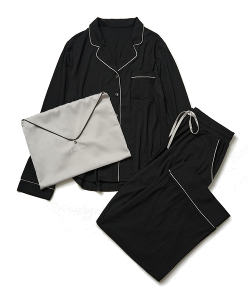 まるで水気を帯びたようなしっとりとした素材を使用したナイトウエア。開襟のベーシックなデザインをベースにしつつ、ボディラインをきれいに見せる工夫が随所にちりばめられている。 スムーススキンナイトウェア 2万5080円(エス バイ) https://ess-by.com/