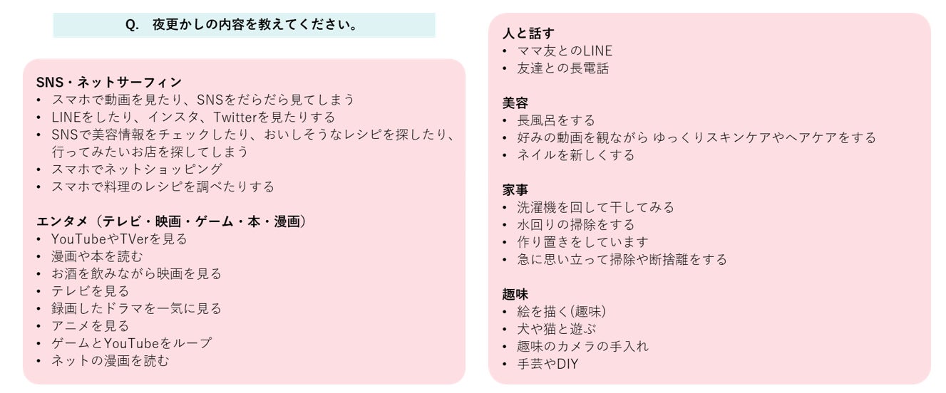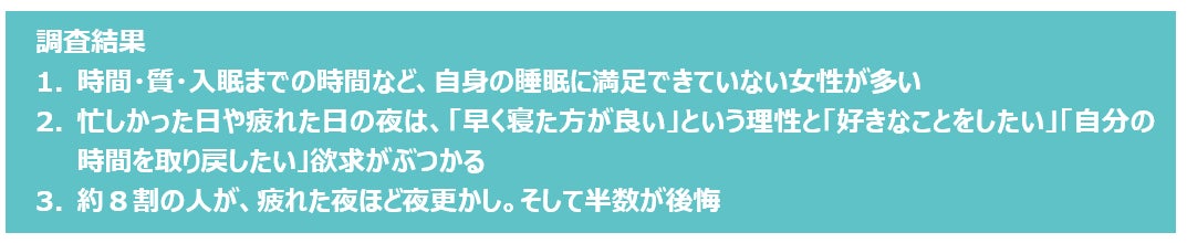 寝たいけど寝たくない、というぶつかり合いの結果、忙しかった日や疲れた日の夜ほど好きなことをしたり、なんとなく夜更かししてしまうことがある人は8割も存在。そのうち77.1%は1時間以上夜更かししており、しっかりと自分の時間を取り戻そうとする人が多いことがわかりました。夜更かしの内容は静的なネットサーフィンやコンテンツ視聴が多いほか、美容や趣味でしっかり起きている人も。ただその結果、翌朝に7割弱が「疲れが取れていない」、半数が「もっと早く寝れば良かった」と後悔しています。ゆえに「今夜こそ早く寝よう」と思う人も半数弱存在しますが、夜になるとやはり夜更かしをしてしまい、同じことを繰り返してしまうのではないでしょうか。