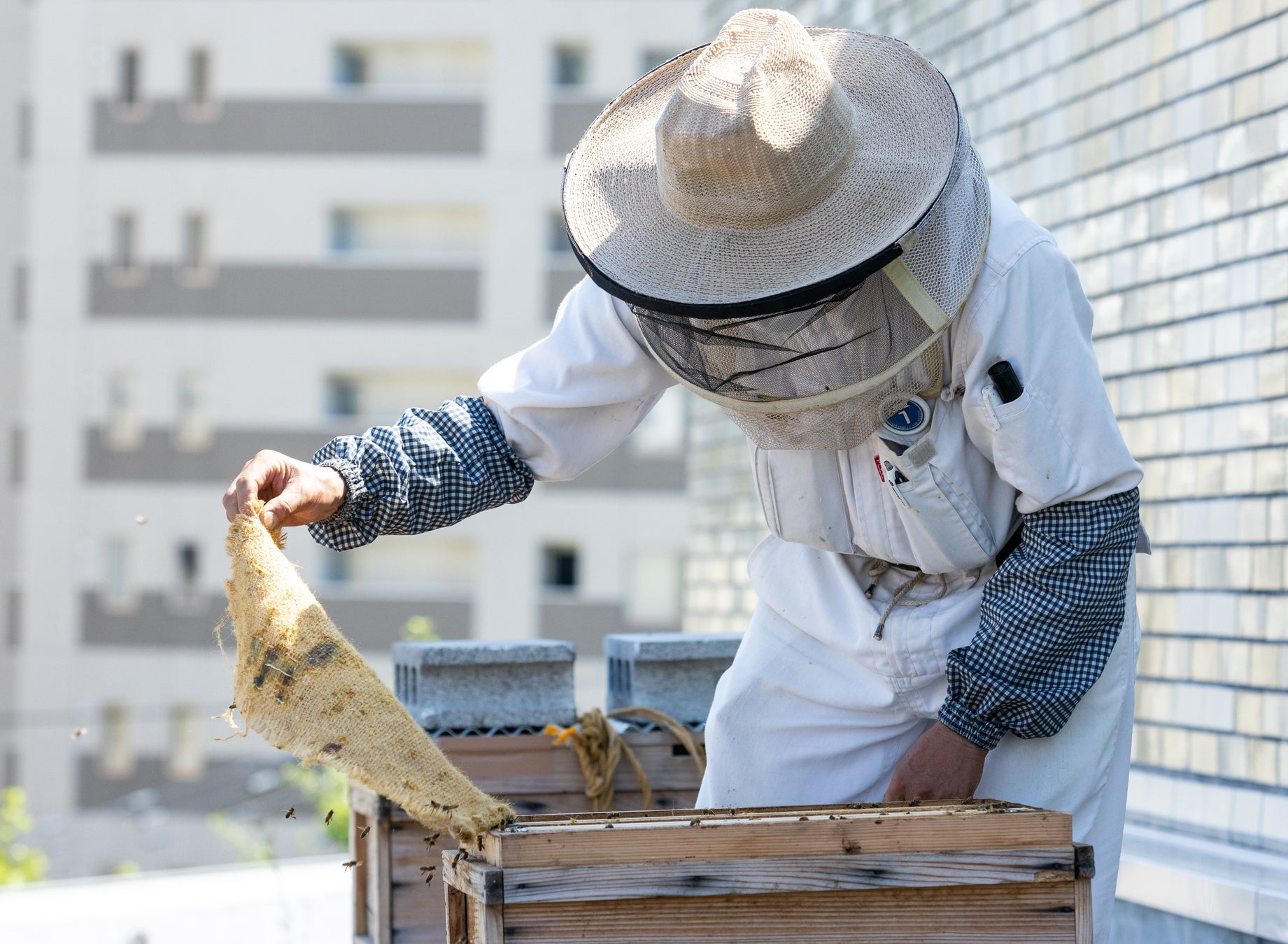 中島公園の一角に位置する札幌パークホテルでは、2022年から「都市型養蜂」の取り組みを開始いたしました。2014年に開園した自社農園「グランビスタファーム サッポロ」にて、肥料や農薬を一切使用せず、土や植物本来の持っている力を最大限に引き出す、環境に優しい木村式農法での自然栽培を実践している経験から、ミツバチが作物の花粉交配に多大な貢献をしていることを学び、それが食料の持続的な確保に繋がると考え、安全面に配慮しながらホテルの屋上で養蜂を行っております。