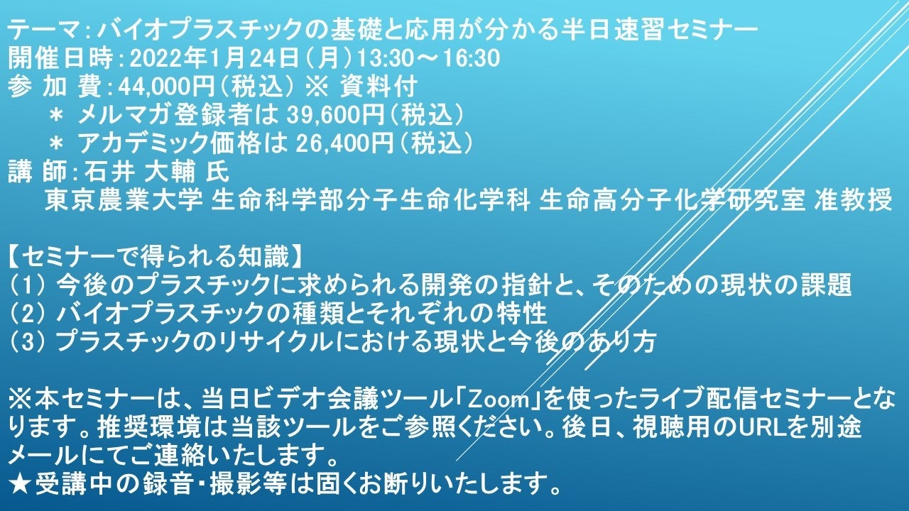 先端技術情報や市場情報を提供している(株)シーエムシー・リサーチ(千代田区神田錦町: https://cmcre.com/ )では、 各種材料・化学品などの市場動向・技術動向のセミナーや書籍発行を行っておりますが、 このたび「バイオプラスチックの基礎と応用が分かる半日速習セミナー」と題するセミナーを、 講師に石井 大輔 氏 東京農業大学 生命科学部分子生命化学科 生命高分子化学研究室 准教授)をお迎えし、2022年1月24日(月)13:30より、 ZOOMを利用したライブ配信で開催いたします。 受講料は、 一般:44,000円(税込)、 弊社メルマガ会員:39,600円(税込)、 アカデミック価格は26,400円(税込)となっております(資料付)。