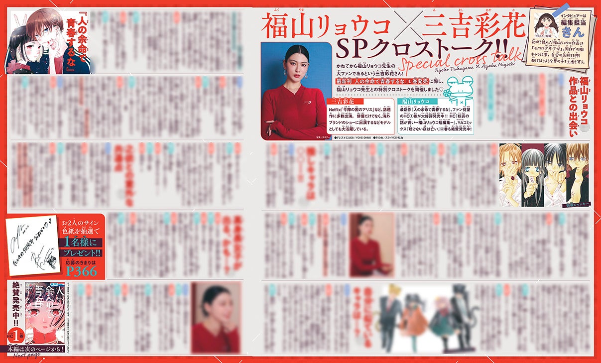 かねてから福山リョウコ先生の大ファンであるという三吉彩花さん!最新刊「人の余命で青春するな」1巻発売に際し、福山リョウコ先生との特別クロストークを開催しました!