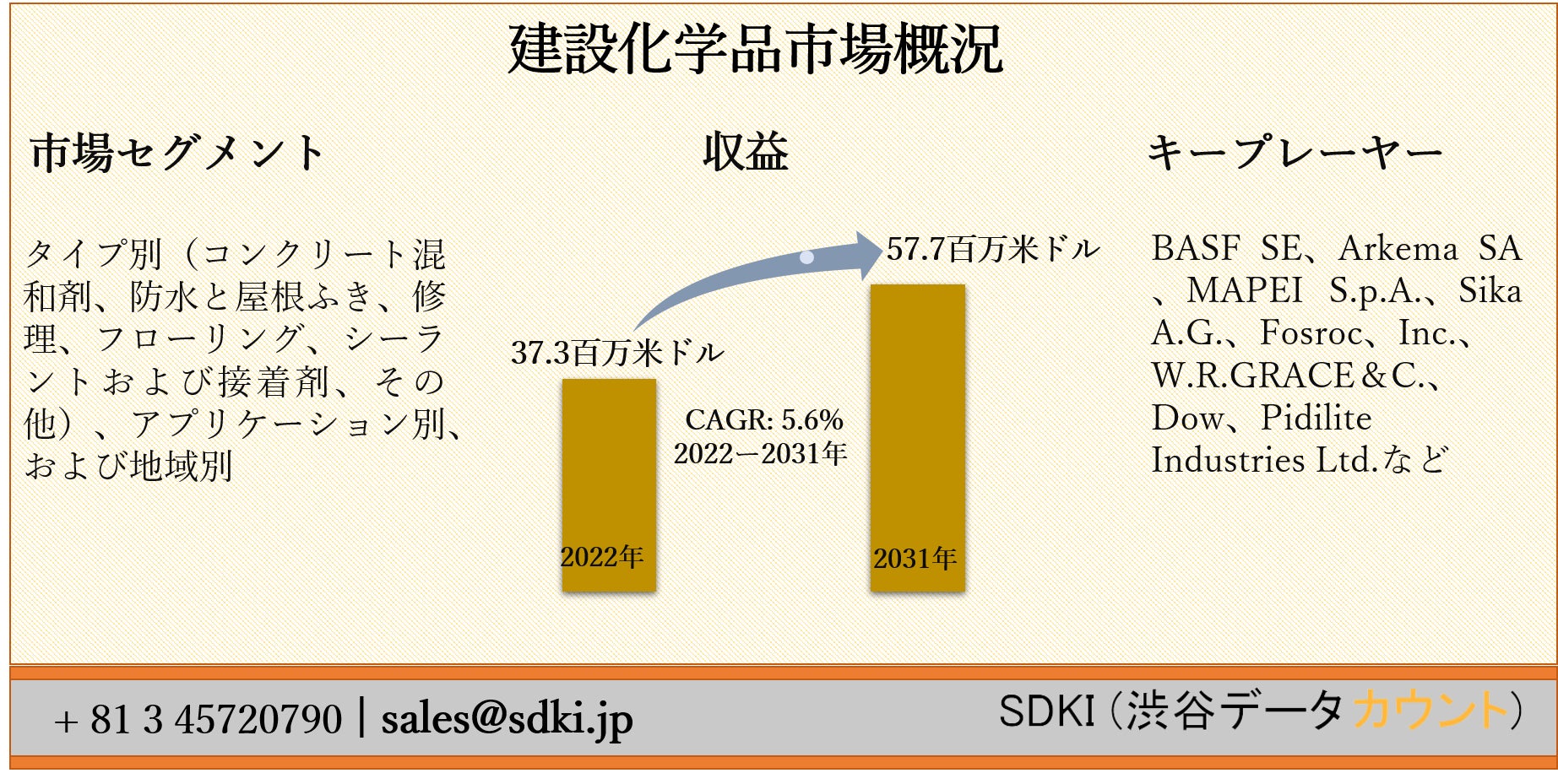 SDKI Inc.は、建設化学品市場の新レポートを2022年01月07日に発刊しました。この調査には、建設化学品市場の成長に必要な統計的および分析的アプローチが含まれています。レポートで提供される主要な産業の洞察は、市場の既存のシナリオに関する読者に市場の概要についてのより良いアイデアを提供します。さらに、レポートには、市場の成長に関連する現在および将来の市場動向に関する詳細な議論が含まれています。